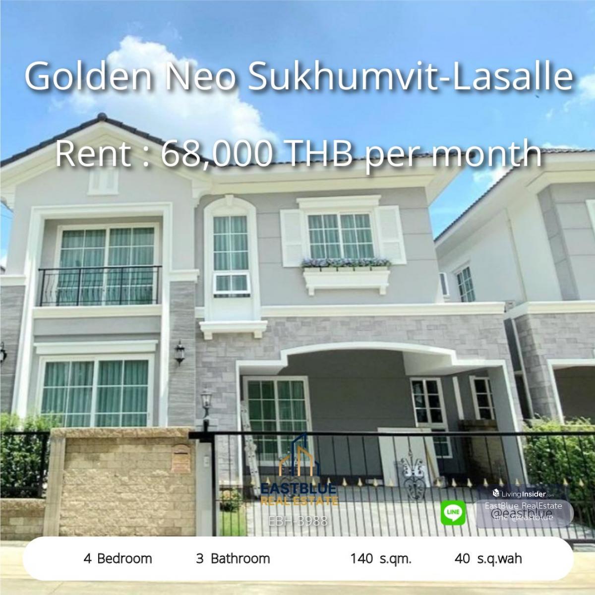 Project : Golden Neo Sukhumvit-Lasalle ID : EBH-3988 4 Bed 3 Baht House Area :140 sqm Land Area :40 sq.wah Rental Price : 68,000 THB per month Selling Price : THB . Contact, Appointment for viewing. call: Contact number WhatsApp: Contact number - Eastblue, we are a team of professional real estate agents. that has been trusted with total sales worth several billion baht With a team of consultants who are experts in buying, selling and investing in real estate. . See more than 50,000 other properties, explore over 50,000 listings on our website: https://www.eastblueth.com ❗️❗️not accept co-agent❗️❗️ . House for rent Golden Neo Sukhumvit-Lasalle 4 bedrooms, 3 bathrooms. Usable area 140 sq m., land 40 sq m. Convenient parking Rental price 68,000 baht/month Project highlights • Modern style house With complete amenities • 24-hour security system. • Public parks and common areas. Nearby places • Thainakarin Hospital 3.5 km. • Bangna School 2.8 km. • Central Bangna 6.5 km. • Mega Bangna 8 km. • BTS Bearing 7.5 km. Suitable for families who want peace and convenience when traveling. #House for rent #GoldenNeoSukhumvitLasalle #Bangna #Latkrabang #Theparak #Luxuryhouse