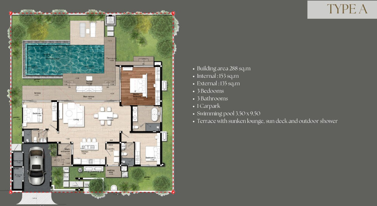 1 spacious living room with a dedicated dining area and a kitchen with an island set into a niche, 3 bedrooms, 3 bathrooms, and a laundry room. Beaches: Layan (11 minutes), Banana Beach, Nai Thon Beach Shopping: Porto de Phuket, Boat Avenue, Lotus’s Thalang (formerly Tesco Lotus) Restaurants: Siam Supper Club, Thai Library at Trisara, Project Artisan Schools: UWC Thailand International School, HeadStart International School Cherngtalay, Montessori House Phuket Sports & Wellness: Laguna Golf Phuket, Thanyapura Sports & Health Resort, Layan Life by Anantara Healthcare: Family Health Care Clinic, Thalang Hospital, BDMS Wellness Clinic Laguna Phuket Project Features 24/7 security Reception Guest parking Swimming pool Garden Villa Features Land plot: 440 sqm Swimming pool: 3.5 × 9.5 m Full privacy Private parking for 1 car Outdoor shower Furniture package available at an additional cost of 2,500,000 THB Online viewing available Remote purchase possible Suitable for owner-occupancy Can be rented out independently