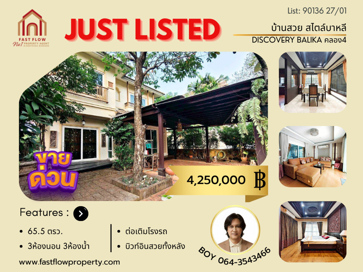 Single house for sale, Balinese style, with high-quality built-in furniture. Discovery Balika, Lam Luk Ka, Khlong 4, Sai Pracharat Road, Phra Ong Chao Sai Road, Rangsit, Khlong 4. Beautiful house with high-quality materials throughout. BOY Interested, please contact Thanabodee (Boy) Fast Flow Property Contact number Line ID: boykrub15 Listing no: 90136 Property Detail: - 2-story single house for sale, Discovery Balika Village, Rangsit-Khlong 4 - House located in Soi 2 - Land area 65.5 square wa - Usable area 200 square meters - South-facing house, good ventilation - 3 bedrooms, 3 bathrooms, 1 living room, 1 family room, 1 dining room, 1 kitchen - Extended garage with tiled floor, parking for 2 cars, and sturdy stone tiling around the house - Inside the house, the ground floor is tiled Upstairs has parquet flooring. - Decorated in Balinese style with built-in display cabinets, wardrobes, beds, partition walls, ceiling lights, downlights, and high-quality kitchen counters. - Curtains throughout the house, 6 air conditioners, water pump with water tank. Project and Facilities: - Discovery Balika project developed by Tara Property Co., Ltd. - Clubhouse/Fitness center/Public park - Common area fee: 1,100 baht per month - CCTV and 24-hour security - Easy Pass system for entering and exiting the village Nearby places: – Beacon House School – Yaem Sa-ard Rangsit School, Chokchai Rangsit School – Paolo Hospital, Sinphet Hospital, Saimai Hospital – Lad Sawai Central Market, A.C. Khlong 4 Market – Big C, Lotus, HomePro, Market Village Khlong 4 – BTS Green Line, Kukot Station, Kanchanaphisek Ring Road, Lam Luk Ka Road, Rangsit-Nakhon Nayok Road Location: https://maps.app.goo.gl/cQrMTdYUPA6uSwoM6 Price: 4,250,000 THB Free bank loan assistance! Viewing available daily. Interested? Price is negotiable. Contact: Mr. Thanabodee (Boy) Contact number Line ID: boykrub15 Contact Fast Flow Property Office Tel: Contact number Line id: @fastflow FB page: facebook.com/fastflowproperty www.fastflowproperty.com We offer free advertising for all types of real estate sales and listings.