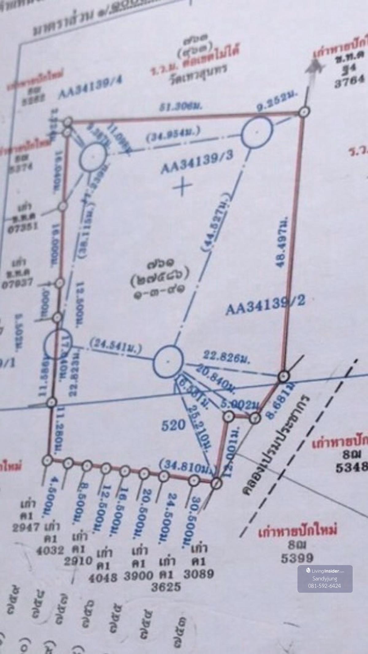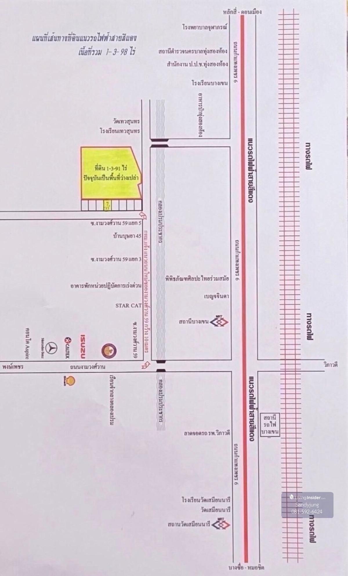 Land along Prem Prachakorn Canal near Bang Khen MRT station (red line) , across from Kasetsart University Land can be entered and exited on 2 sides, both on Kamphaeng Phet 6 Road and Ngamwongwan Road Soi 59 Area 1 rai 3 ngan 91 square wah Orange layout Selling for 200,000 baht per square wah If interested, contact Sai Contact number