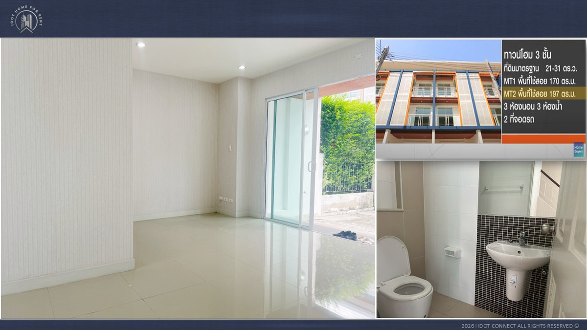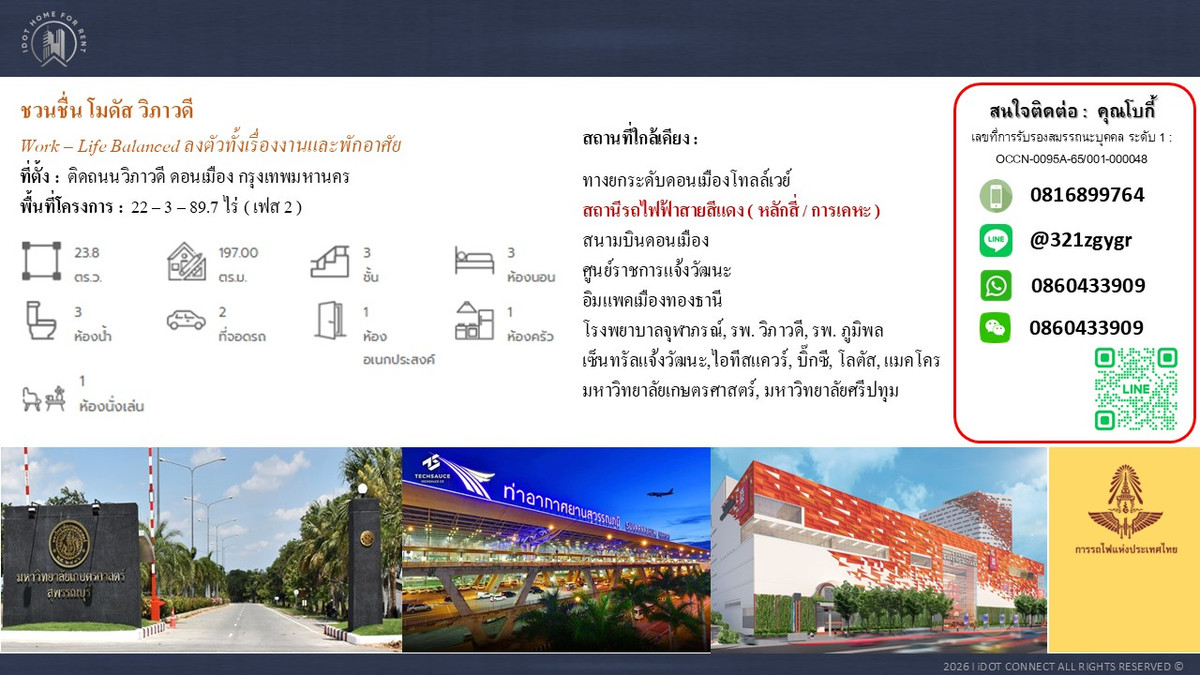 CHUAN CHUEN MODUS VIPHAVADI Chuan Chuen Modus Vibhavadi 3-Story Town House for Rent near Lak Si SRT - Housing Authority 3-BED I 3-BATH I 2 PARKING LOTS I 197 sqm. THB 20,000 Project details: Chuan Chuen Modus Vibhavadi Phase 2 Townhouse, good location near Don Mueang Airport. Convenient travel Complete facilities Surrounded by green space With a beautiful common garden. The house design is unique and beautiful. Ready to provide valuable usable space. So that you live in a quality society that is not crowded Facilities Fitness I Park I Security system such as Key Card Access, CCTV and 24-hour security guard Map https://maps.app.goo.gl/6xqR63BNUUuhaXuo7 Nearby Places : Don Mueang Tollway Elevated I Red Line Station (Lak Si / Housing Authority) I Don Mueang Airport I Chaengwattana Government Center I Impact Muang Thong Thani I Central Chaengwattana I IT Square I Big C I Lotus I Makro I Kasetsart University I Sripatum University I Chulabhorn Hospital I Vibhavadi Hospital I Bhumibol Hospital Contact: BOGIE Contact number Line: @321zgygr or click link : https://lin.ee/w5ds91K Exclusive Contract Agent (Certified by TPQI Level - 1)
