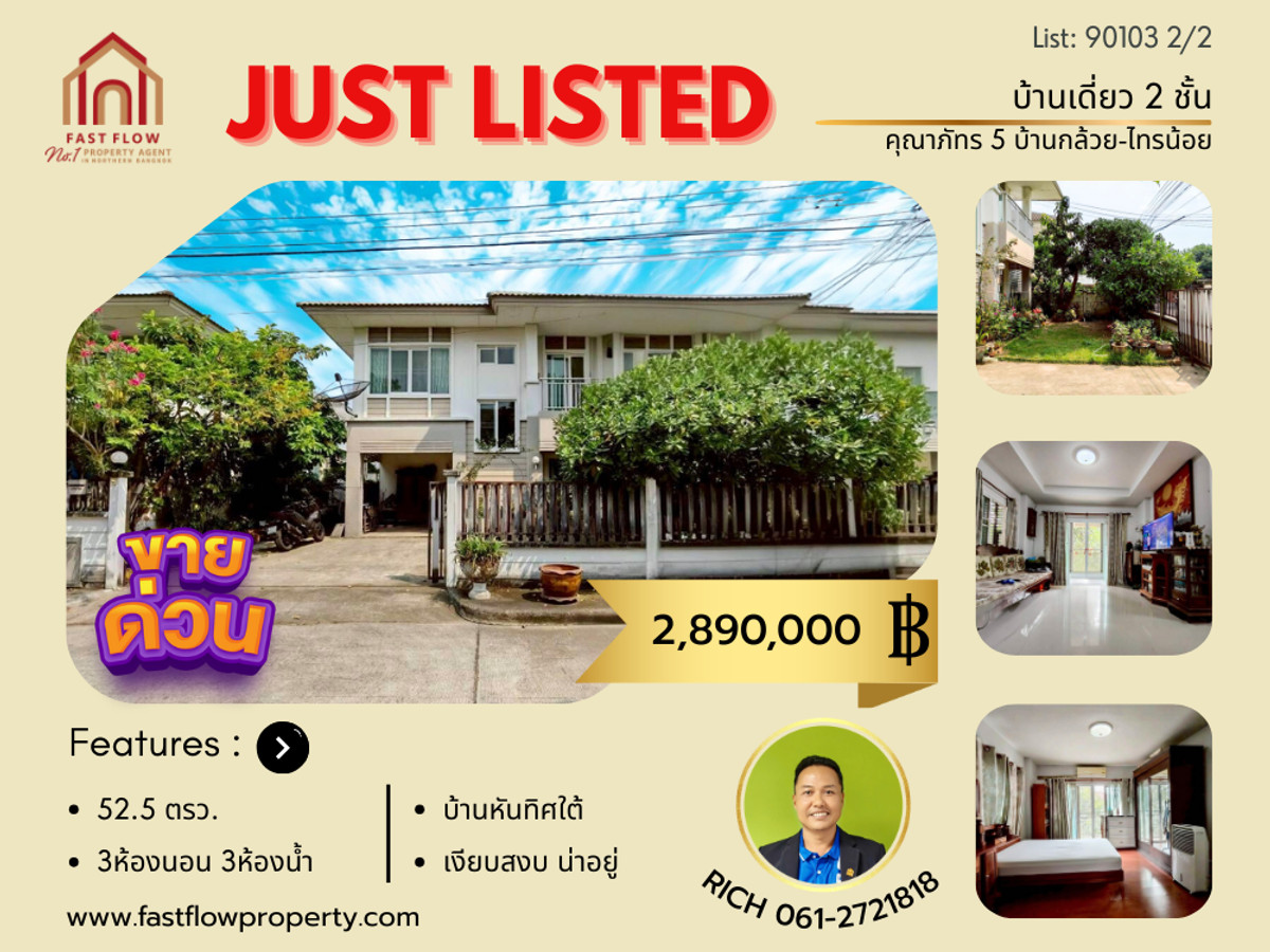 For Sale: 2-story detached house in Khunaphat 5 Village, Ban Kluay-Sai Noi Road, 52.5 sq.wah, Soi Buathong 4, RICH. Contact: Bunyarit, Fast Flow Property, Contact number Line ID: Contact number Listing No: 90103 Property Details: - 2-story detached house for sale in Khunaphat 5 Village. - Good location, house is in Soi 19. - Land size: 52.5 square wah. - Usable area: 136 square meters. - South-facing house, good ventilation. - 3 bedrooms, 3 bathrooms, living room, prayer room. - Kitchen with high-quality concrete counter. - Parking for 2 cars inside the house. - Ground floor tiled with granite. - Laminate flooring upstairs. - House sold unfurnished, easy to renovate and extend. - Includes 2 air conditioners. - Located in a gated community. - Monthly common area fee: 787 baht. - CCTV and 24-hour security. Nearby locations: - MRT Purple Line, Khlong Bang Phai Station - Mary Wittaya Nonthaburi School, Bang Khulad School, Bang Bua Thong School, Nanthaworawit School - Pimolraj Hospital, Krung Thai Western Hospital, Bang Bua Thong Hospital, Bang Yai Hospital - Central Westgate, IKEA Bang Yai, The Square Bang Yai Nonthaburi, Lotus Go Fresh, Big C Sai Noi Location: https://maps.app.goo.gl/ybsNBxHjaopM53Ce8 Price: 2,890,000 baht Free bank loan assistance service! Viewing available daily. Interested? Price is negotiable. Contact: Mr. Bunyarit (RICH) Contact number Line ID: Contact number Contact Fast Flow Property Office Tel: Contact number Line ID: @fastflow FB page: facebook.com/fastflowproperty www.fastflowproperty.com We offer property sales services for all types of real estate. Free advertising.
