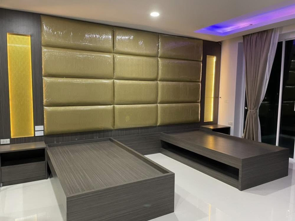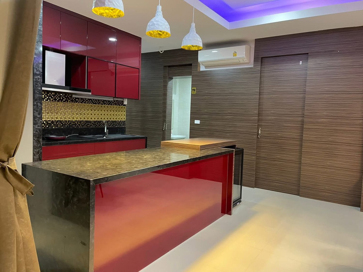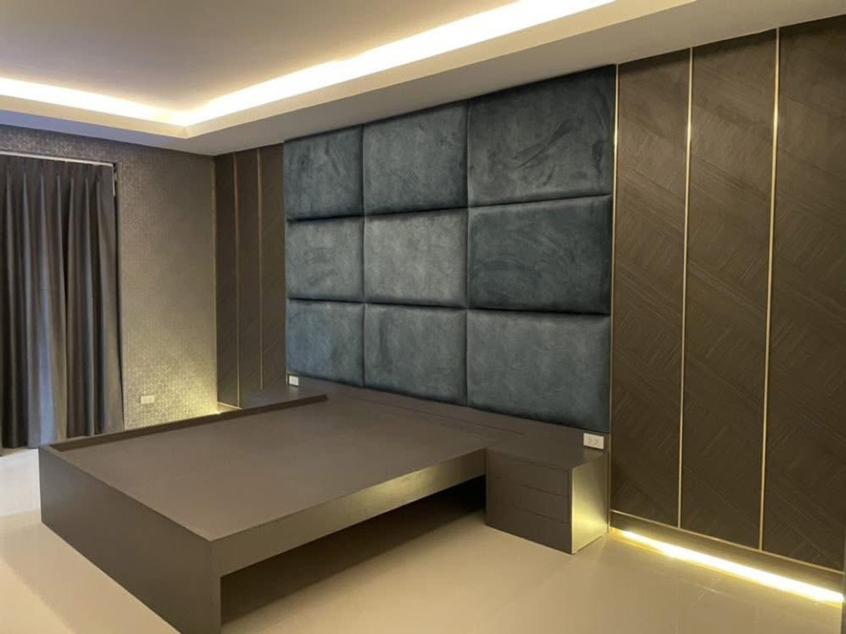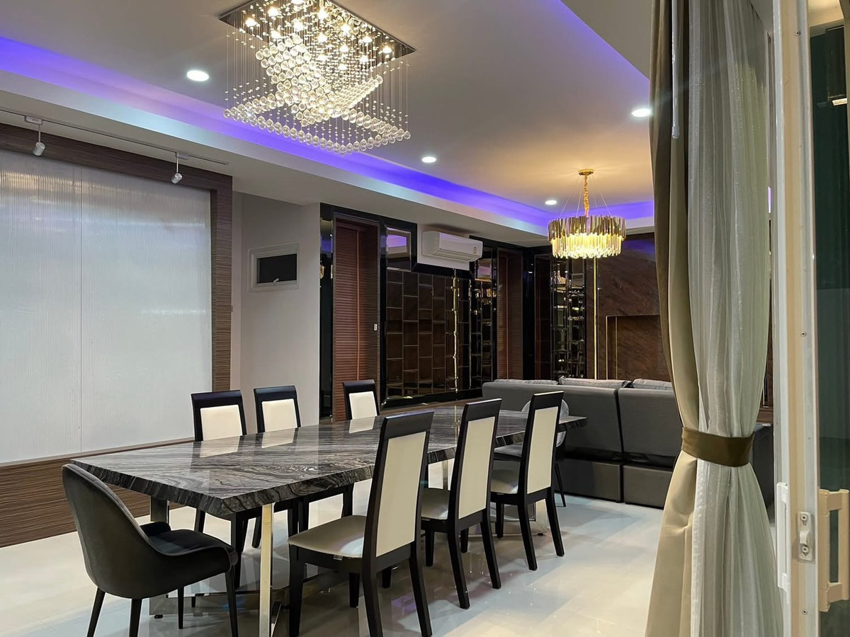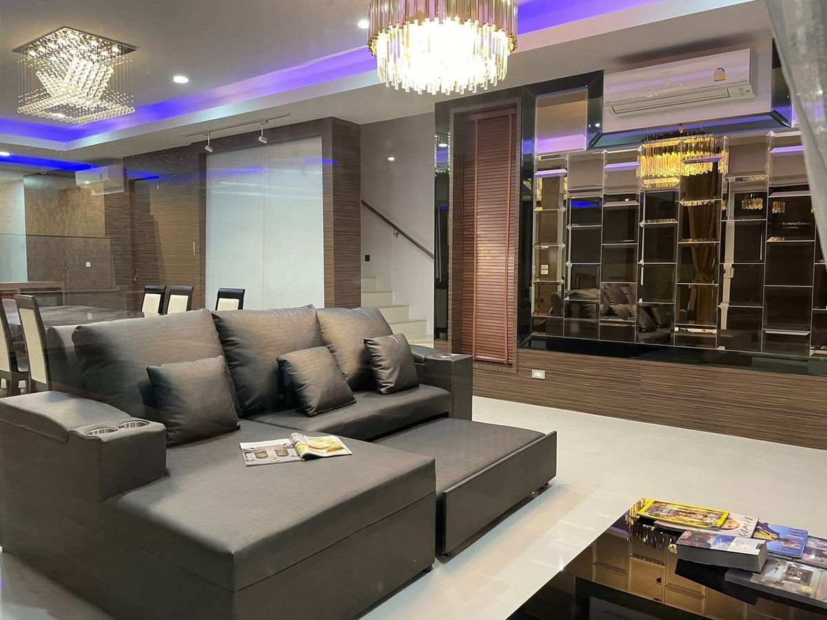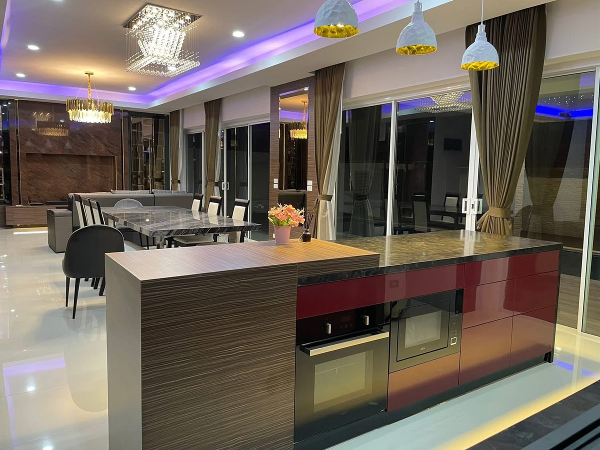 PALM LAKESIDE VILLAS • Usable area 486 sq m. - Land 99.6 sq m. • 5 bedrooms (including maid) + Walk-In Closet • 2 living rooms | 5 bathrooms | 4 large balconies • Thai-Western kitchen | Pet room/storage room | Laundry room • I-Spa Jacuzzi + Rain Shower System, color changing lights • Digital Door Lock | Remote-controlled parking for 2 cars | 8-point CCTV cameras • Private swimming pool + waterfall curtain | BBQ area Complete facilities • Air conditioner 9 | TV 5 | Washing machine • Electric–gas stove + range hood • Dishwasher | Water filter | Oven | Microwave • Refrigerator 2 | Wine refrigerator