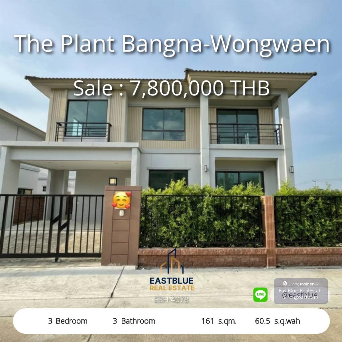 Project : The Plant Bangna-Wongwaen ID : EBH-4078 3 Bed 3 Baht House Area :161 sqm Land Area :60.5 sq.wah Rental Price : THB per month Selling Price : 7,800,000 THB . Contact, Appointment for viewing. call: Contact number WhatsApp: Contact number - Eastblue, we are a team of professional real estate agents. that has been trusted with total sales worth several billion baht With a team of consultants who are experts in buying, selling and investing in real estate. . See more than 50,000 other properties, explore over 50,000 listings on our website: https://www.eastblueth.com ❗️❗️not accept co-agent❗️❗️ . 2-story detached house for sale, The Plant Bangna–Wongwaen, Sukhapiban 2. Property details • 3 bedrooms, 3 bathrooms, 2 parking spaces • Usable area 161 sq m., land 60.5 sq m. • Corner plot house, close to the park and clubhouse. • The front of the house faces south, cool breeze. Free gifts and home systems • Complete furniture and electrical appliances. Ready to move in • Complete Smart Home system • CCTV cameras around the house. • Digital Door Lock • Smart Switch WiFi • Air conditioning, WiFi in almost the entire house. Project highlights • New house, only 1 year old, long structural warranty remaining. • Corner plot has wide space next to the house. • Quality projects Bangna-Wongwaen location, convenient travel. • Quiet, private atmosphere, lovely neighbors. There is no parking in front of the house. Nearby places • Pathumwan Hospital 5.6 km. • Bangkok Patana International School 4.3 km. • Makro Bangna 3.2 km. • Central Bangna 5.0 km. • Bangna Market 3.8 km. • Bang Phli Reservoir 6.0 km. Selling price 7,800,000 baht Can negotiate #House for sale in Bangna #ThePlantBangnaWongwaen #Bangna detached house #second-hand house #ready-to-move-in house