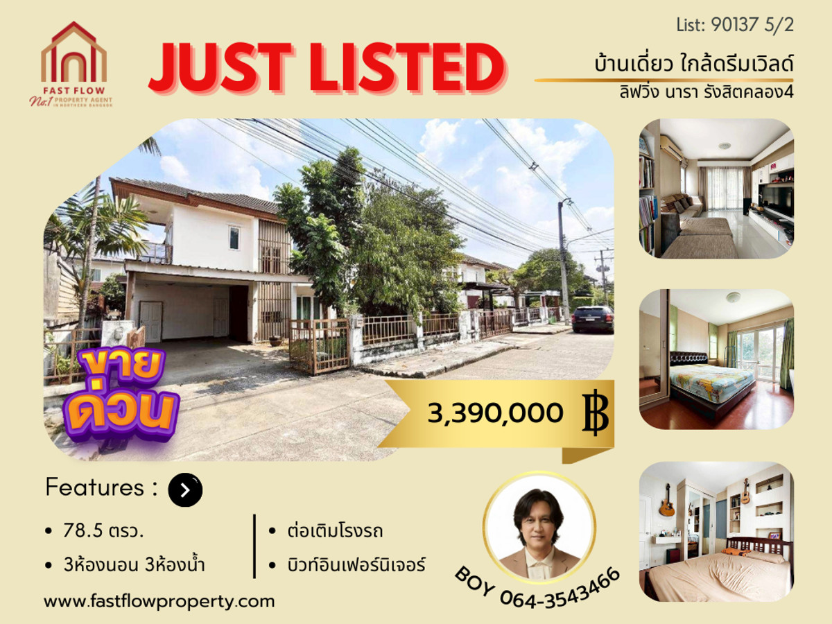 Single house for sale Living Nara Rangsit Village, Khlong 4, project next to Rangsit-Nakhon Nayok Road, adding a garage, some built-in furniture, Living Nara BOY. If interested, contact Thanabadee (Boy) Fast Flow Property Contact number Line ID: boykrub15 Listing no : 90137 Property Detail: - 2-story detached house for sale, project name Living Village Nara Rangsit Khlong 4 - House in a good position Located next to the village's main road, near a garden. - Land 78.5 square meters - House type L, usable area 138 square meters, if including the garage addition, approximately 170 square meters. - The front of the house faces west. Receive the afternoon sunshine - There are 3 bedrooms, 3 bathrooms, 1 living room, 1 dining room, 1 kitchen. - Addition of garage, able to park 2 cars indoors - The ground floor has granite countertops. The upper floor is covered with laminate. - Built in TV shelf bookshelf Wardrobe in the bedroom and bedside shelves - Good kitchen counter With electric stove head and exhaust hood - Sold with 4 air conditioners. Project and Facilities: - Living Nara Project developed by Topline Living Company Limited. - Clubhouse, CCTV and security guard 24 hours - Enter and exit the village with the Easy Pass system. - Common fee 942 baht per month Nearby places: - Near Dream World - Big C, Lotus Rangsit Klong 4, Home pro, Market Village Klong 4, Future Park Rangsit - Siam International School, Beacon House School Yaem Sa-at Rangsit, Chokchai Rangsit School - North Bangkok University, Rangsit University - Paolo Hospital, Synphaet Hospital, Saimai Hospital - DD Macher Market, Lat Sawai Central Market - Kanchanaphisek Ring Road Location: https://maps.app.goo.gl/Yk5EgB188W4ye7VC6 Price 3,390,000 baht Free bank loan assistance service! You can make an appointment to visit the actual location every day. If interested, the price can be discussed. Contact Mr. Thanabadee (Boy) Contact number Line ID: boykrub15 Contact Fast Flow Property Office Tel: Contact number Line id: @fastflow FB page: facebook.com/fastflowproperty www.fastflowproperty.com Service for consignment of all types of real estate. Free advertising fees.