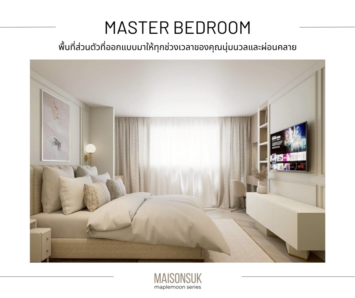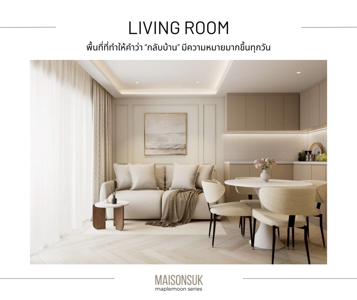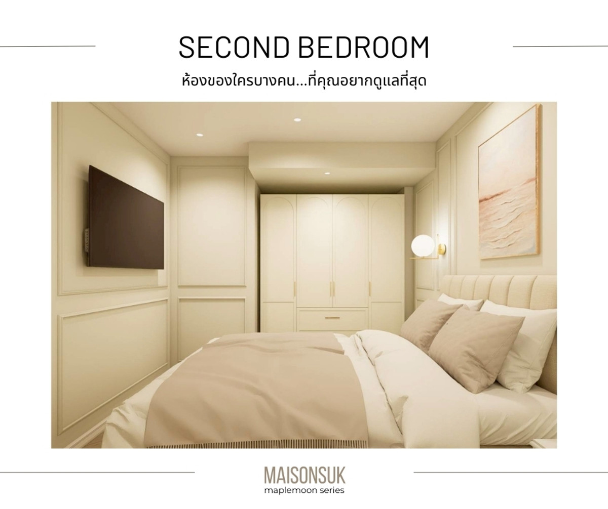 MAISON SUK - Warm European style condo. that feels like a Boutique Home Subhayakaew Tower 63 sq m | 2 bedrooms, 1 bathroom | 24th floor | Transparent city view as far as the eye can see. Launch price only 3.59 million baht [Ready to move in on 1 April 2026] The design in the room is inspired by modern European homes. Framed cornice walls, cream, beige, ivory tones and soft lighting. Create a gentle, luxurious atmosphere. Highlight of this room (Highlight Maison Suk) ✨ Parisian Soft Modern design: moldings, curved lines and cream-beige tones. Gives the feel of a luxurious European home in a gentle way. ✨ Bedroom feels like Boutique Hotel: Feels like staying in a small, warm hotel…every night. ✨ Corners that connect families: sofas, dining tables, and common areas. It is designed to be a gathering point for people in the house. ✨ Wide living room Clear dining corner The bedroom is proportional. Really live every day ✨ The second bedroom can be used as a children's room, office room, or living room. Suitable for people looking for a house that is 💞 Suitable for couples or small families who want to have a warm home to live together. ✅ 63 sq m. | 2 bedrooms, 1 bathroom ✅ Kitchen set + complete furniture Ready to move in ✅Digital Door lock ✅ 3 air conditioners ✅Water heater ✅TV 42 - 50 inches x 2 units ✅ 2 layers of curtains ✅Bed with mattress and pajamas, size 6 feet, master bedroom ✅Bed with mattress and pajamas size 5 feet, second bedroom ✅Dining table + chairs ✅Large sofa set + fluffy carpet Opening price before renovation, special only 3.59 million baht (from normal 3.69 million baht) [Ready to move in on 1 April 2026] ** All photos are 3D images from the design. ================ [ 𝗖𝗼𝗻𝘁𝗮𝗰𝘁 ] • Mobile: Contact number (New) • 𝗧𝗶𝗸𝘁𝗼𝗸 : maplemoon room project