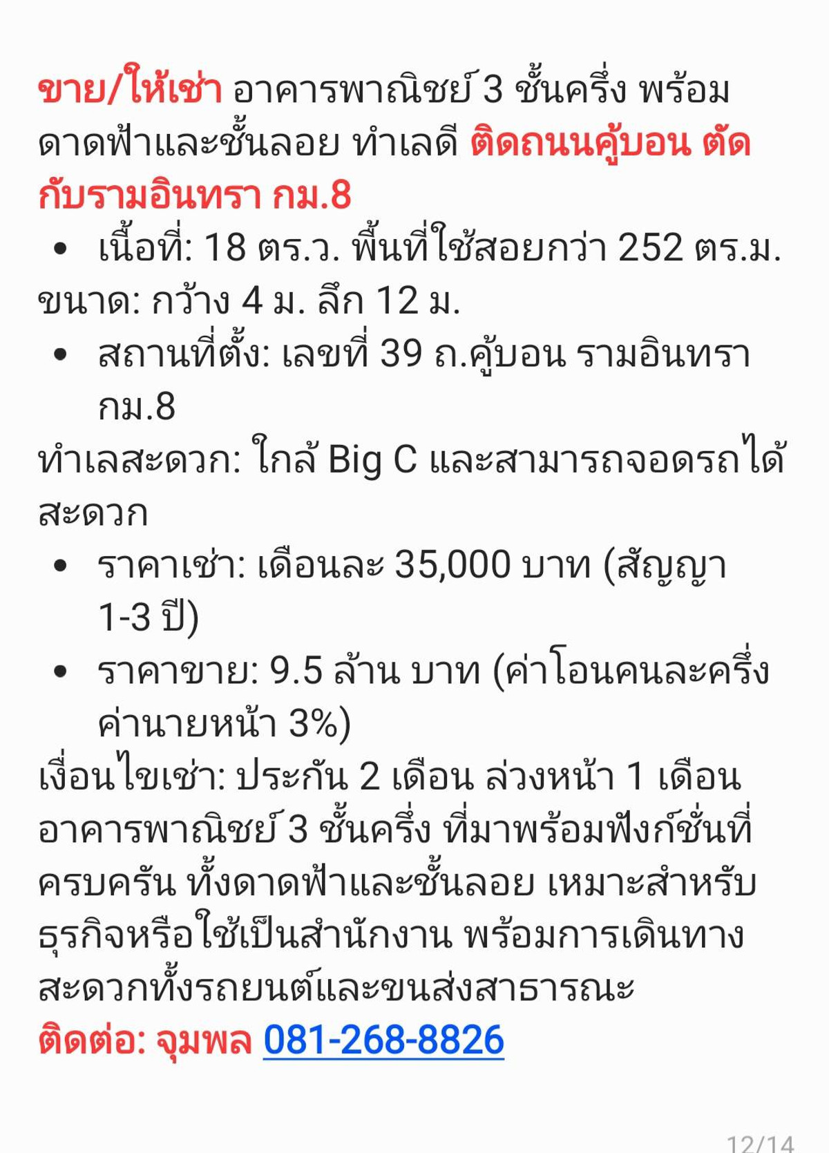 Sell ​​or rent invest in default bonds, lost money invest in a house Save the rent, passive income, sell the house, capital gain, not much profit, but beat inflation, beat interest on deposits Commercial building, 3 and a half floors (1 room , area 18 sq m., usable area 252 sq m., width 4 m., depth 12 m., has rooftop and mezzanine , No. 39 Khubon Rd., Ramintra Km. 8 , near Big C (can park), rent per month. 35,000 Female, 1-3 years, warranty 2 months, advance 1 month Selling for 9.5 million, transfer fee is half each, brokerage fee 3% Contact Jumpol. Contact number