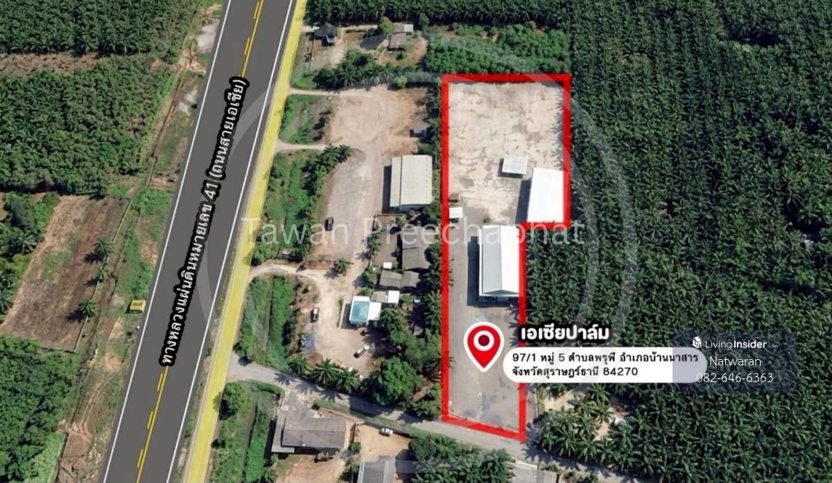 Large plot of land, area 7 rai 1 ngan 28 square wah with warehouse, factory and office building , prime location. Next to the old Asian road And only 40 meters from Asia 41 Road Convenient transportation, there are 2 entrances and exits ⸻ ⸻ 📌 Location 📍 97 Village No. 5, Phru Phi Subdistrict, Ban Na San District. Surat Thani Province 84270