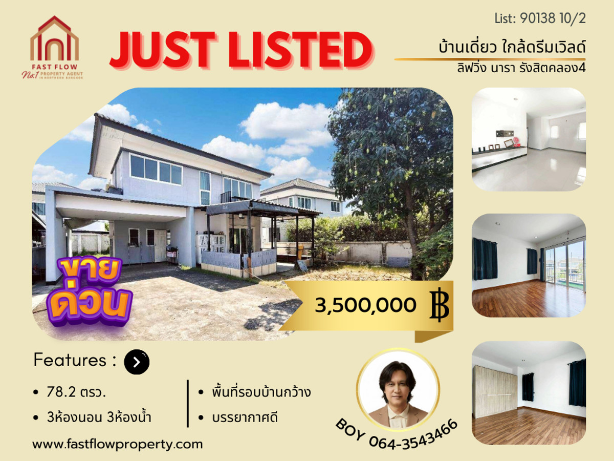 Single house for sale near Dream World, Living Nara Rangsit-Khlong 4 Village, located on Rangsit-Nakhon Nayok Road. Features an extended front yard living area. Contact: Thanabodee (Boy) Fast Flow Property Contact number Line ID: boykrub15 Listing no: 90138 Property Details: - 2-story single house for sale in Living Nara Rangsit-Khlong 4 Village - Prime location, situated on the main road - Land size: 78.2 square wa - Usable area: 106 square meters, including the extended front yard living area, approximately 130 square meters - West-facing, receiving afternoon sunlight - 3 bedrooms, 3 bathrooms, 1 living room, 1 kitchen - Spacious front yard, parking for 4-5 cars inside the fence - Granite tile flooring on the ground floor, laminate flooring on the upper floor - House sold with bedroom wardrobes and curtains - Blinds/curtains on the ground floor - 2 air conditioners Project and Facilities: - Living Nara Project developed by Topline Living Co., Ltd. - Clubhouse, CCTV, and 24-hour security - Easy Pass access system for entering and exiting the village - Monthly common area fee: 940 baht Nearby Places: - Near Dream World - Big C, Lotus Rangsit Khlong 4, Home Pro, Market Village Khlong 4, Future Park Rangsit - Siam International School, Beacon House Yaem Sa-ard Rangsit School, Chokchai Rangsit School - North Bangkok University, Rangsit University - Paolo Hospital, Sinphet Hospital, Saimai Hospital - Dee Dee Marche Market, Lad Saway Central Market - Kanchanaphisek Ring Road Location: https://maps.app.goo.gl/GU5cvWoBuThqte1z7 Price: 3,500,000 THB Free bank loan assistance service! Viewing available daily. Price negotiable. Contact: Thanabodee (Boy) Contact number Line ID: boykrub15 Contact Fast Flow Property Office Tel: Contact number Line id: @fastflow FB page: facebook.com/fastflowproperty www.fastflowproperty.com Property sales service for all types of properties. Free advertising.