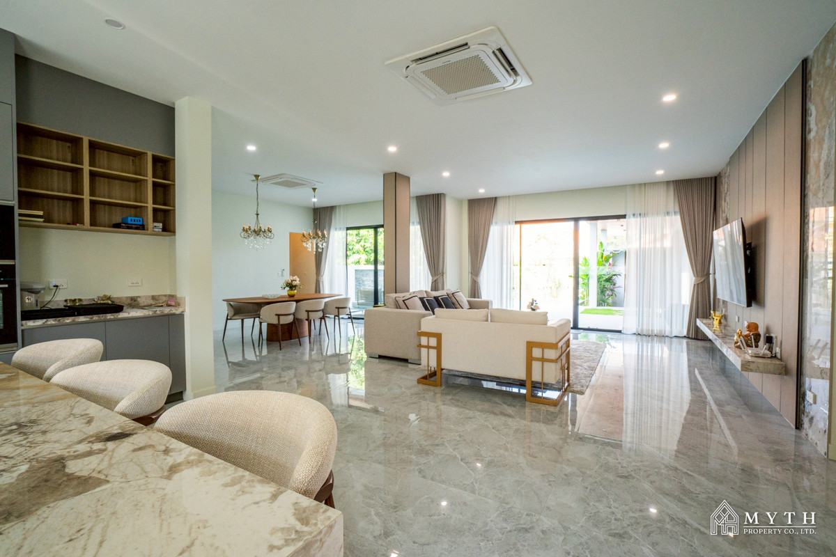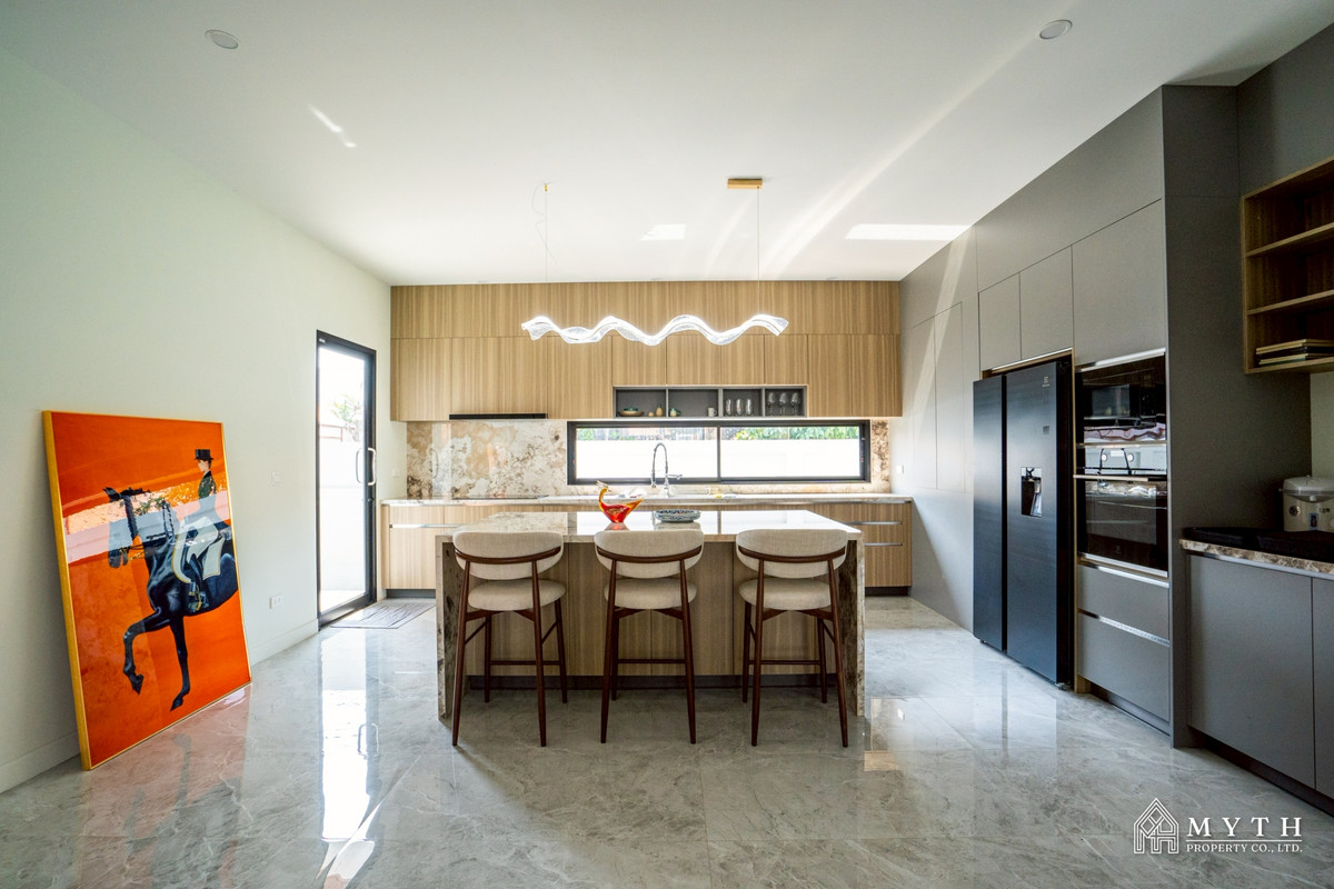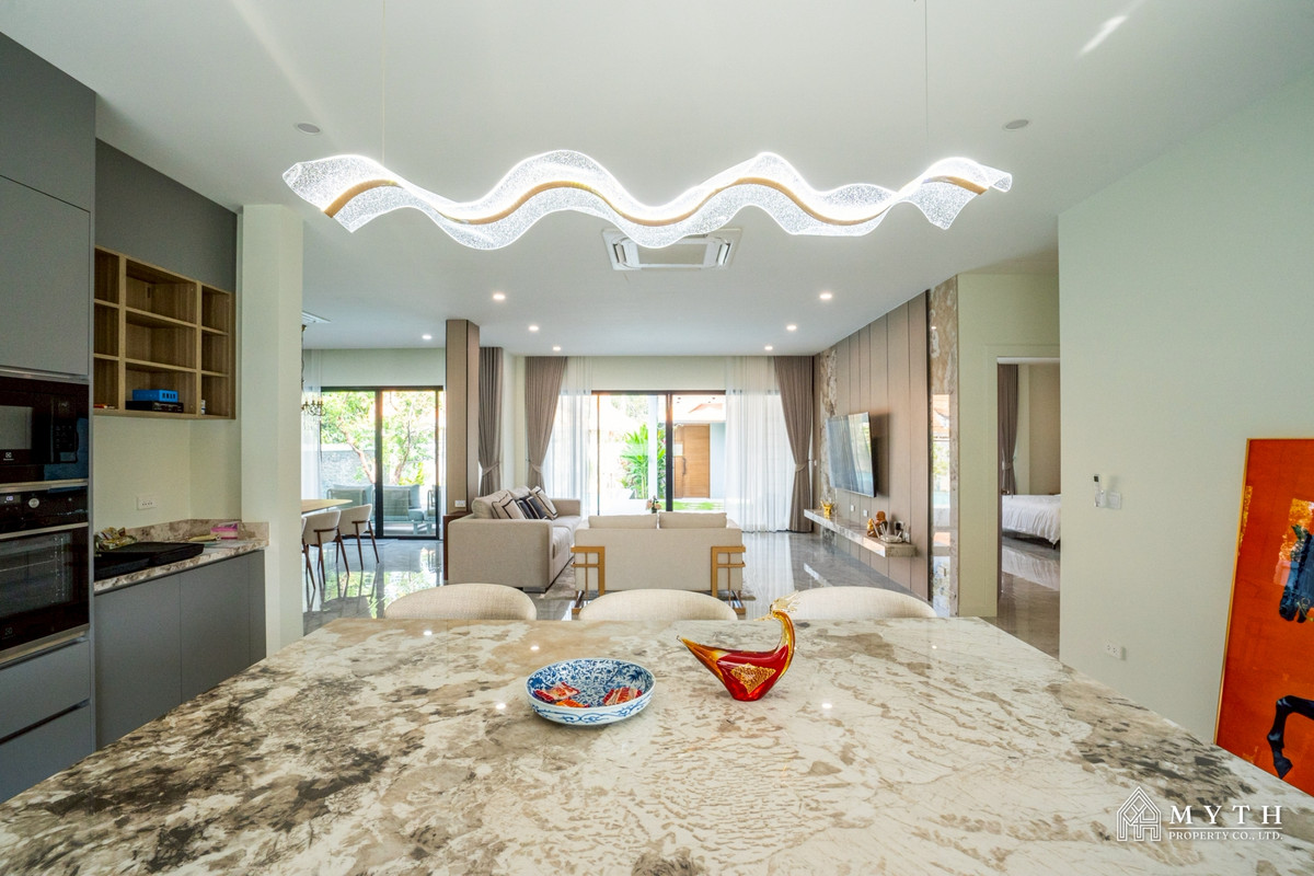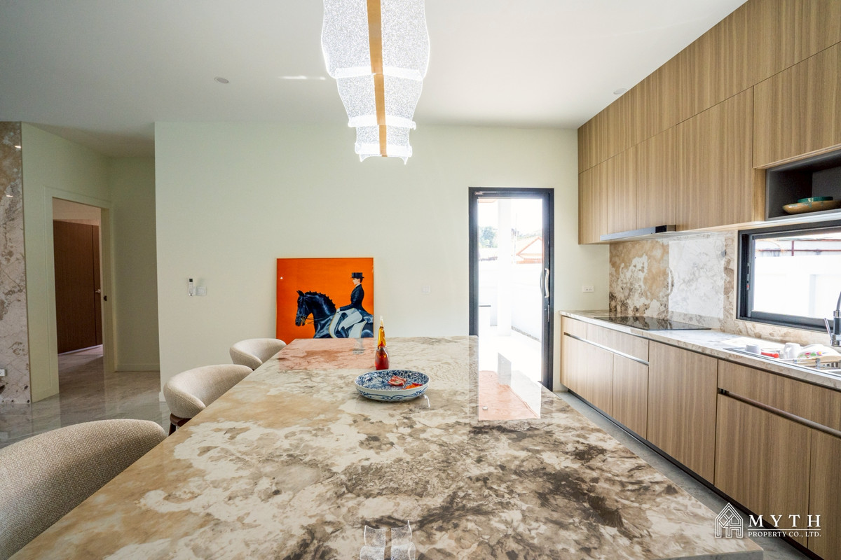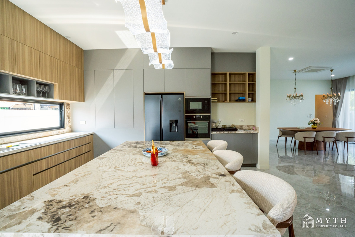 Private pool villa set on a large land plot, offering a complete functional layout and ready to move in immediately. Beautiful built-in kitchen with a stylish island, plus a separate Thai kitchen with