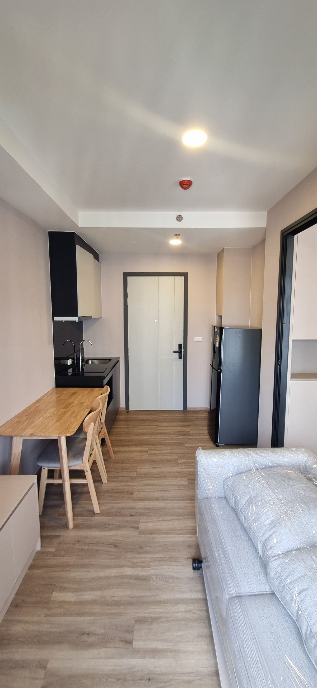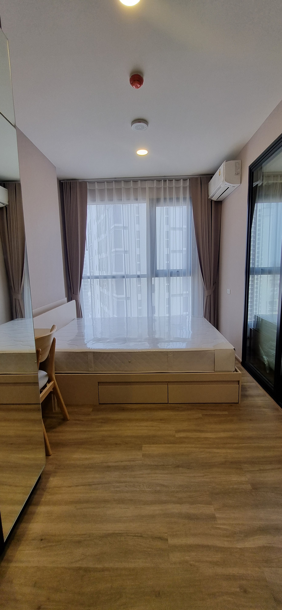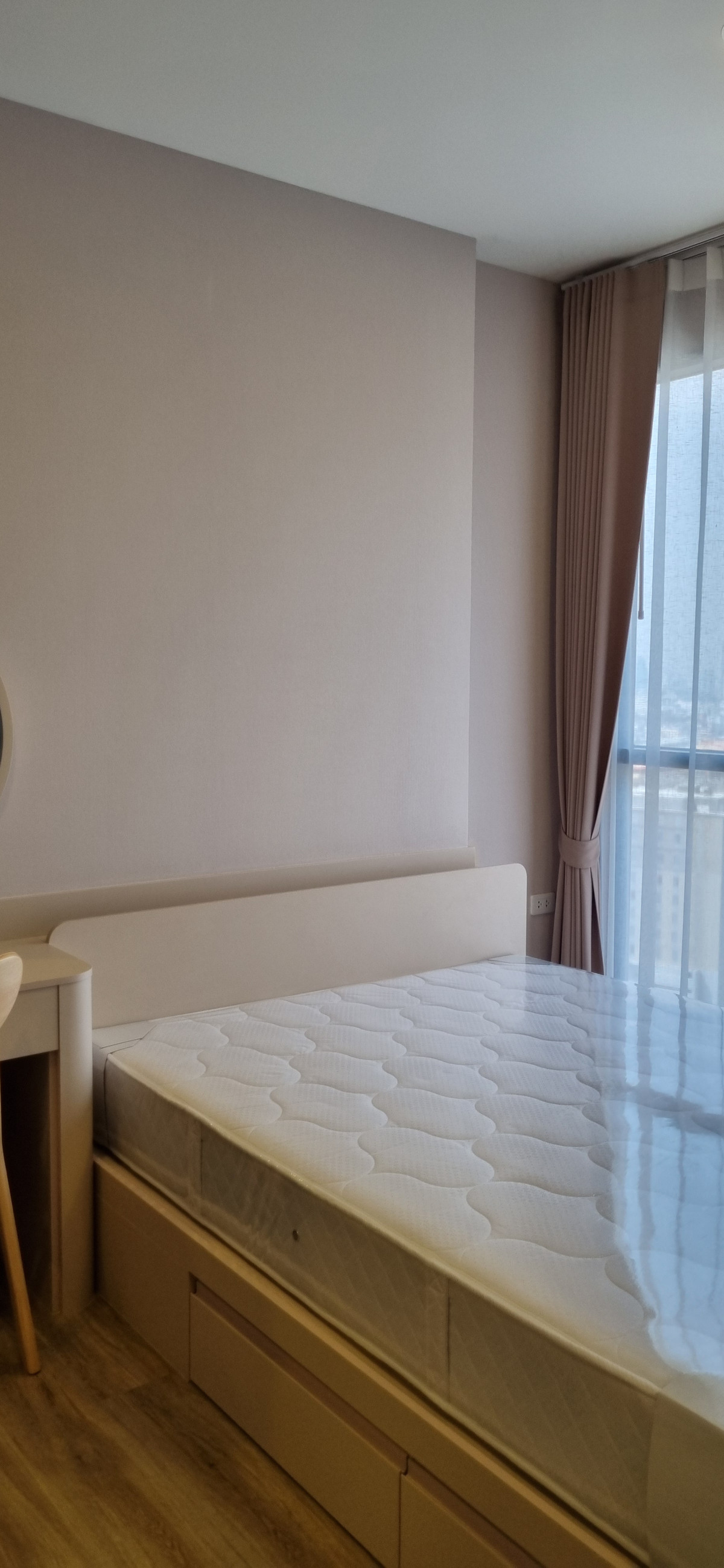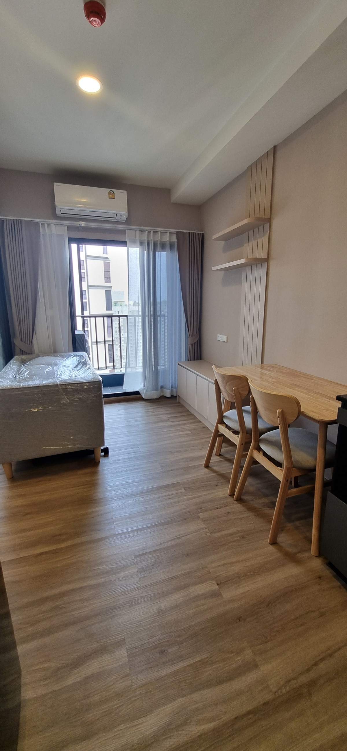 Decorated in Nordic Contemporary Living style, warm, gentle tones, beige, gray, light pink, giving a feeling of elegance, warmth, and airiness with minimalist design wooden furniture. simple lines There arent many patterns. The room receives natural light from large windows + completely blackout curtains. The atmosphere is clean New room, first hand 1 bedroom, size 26.82 square meters 1 bedroom, 1 bathroom, living room, open kitchen Built-in furniture with electrical appliances