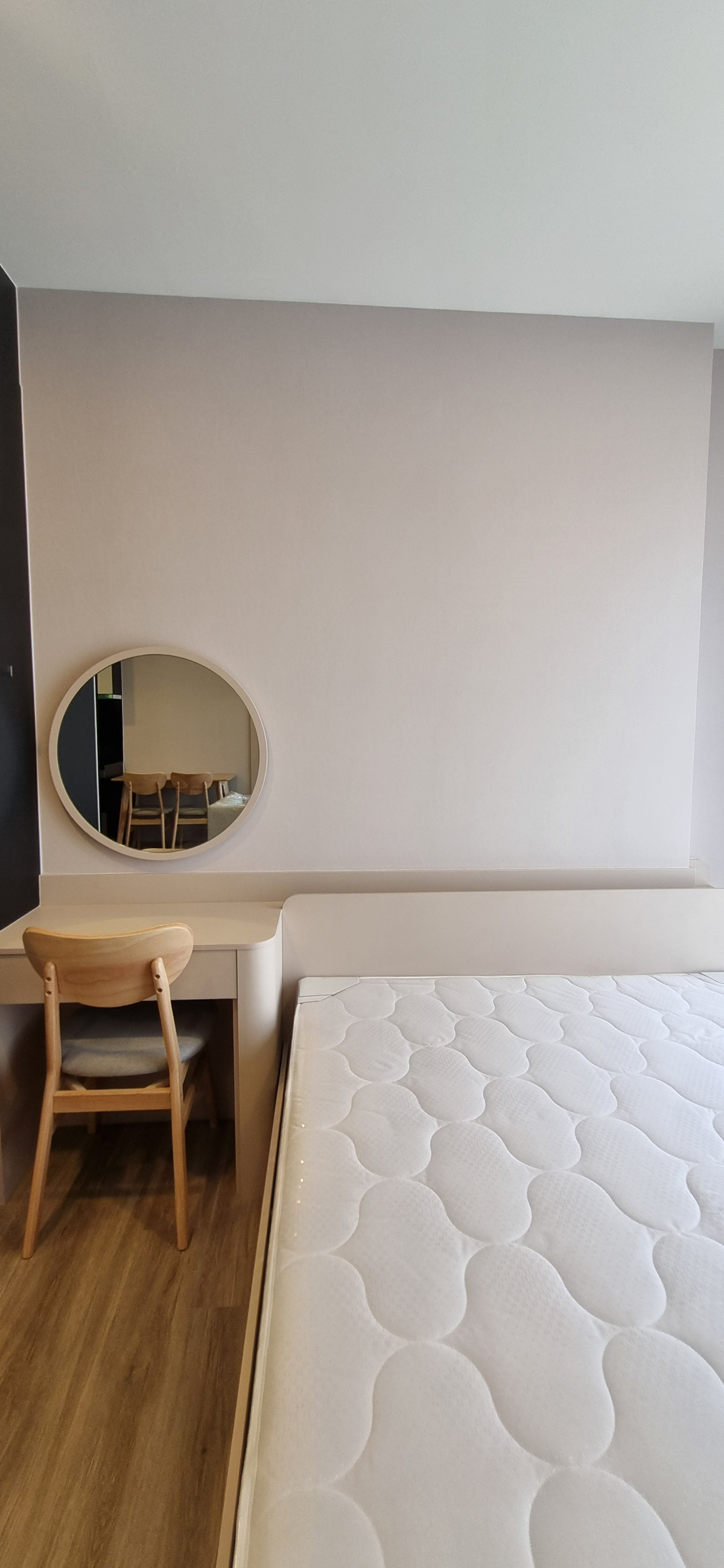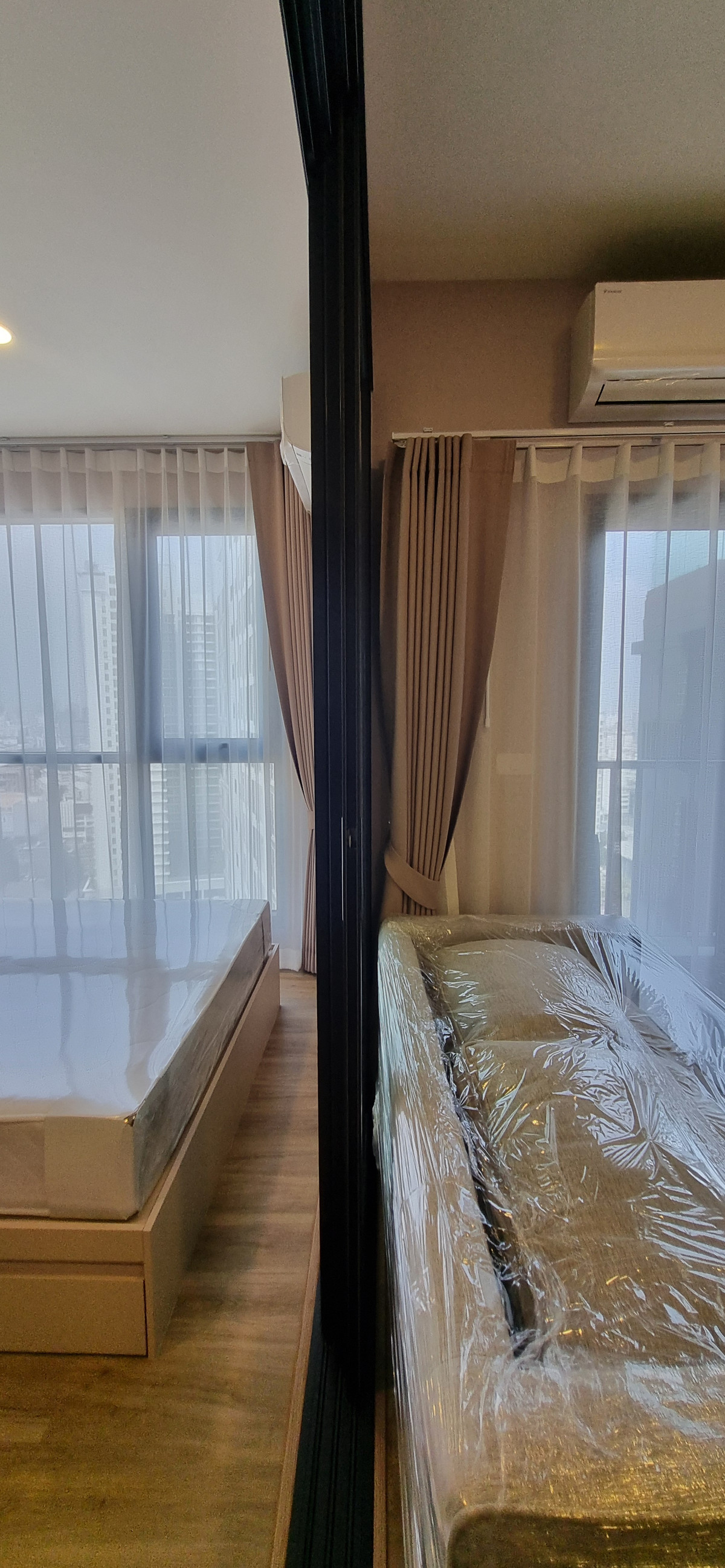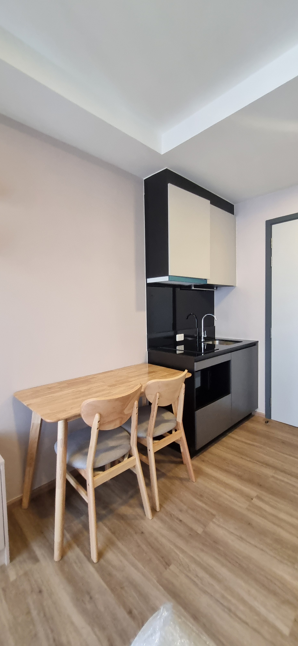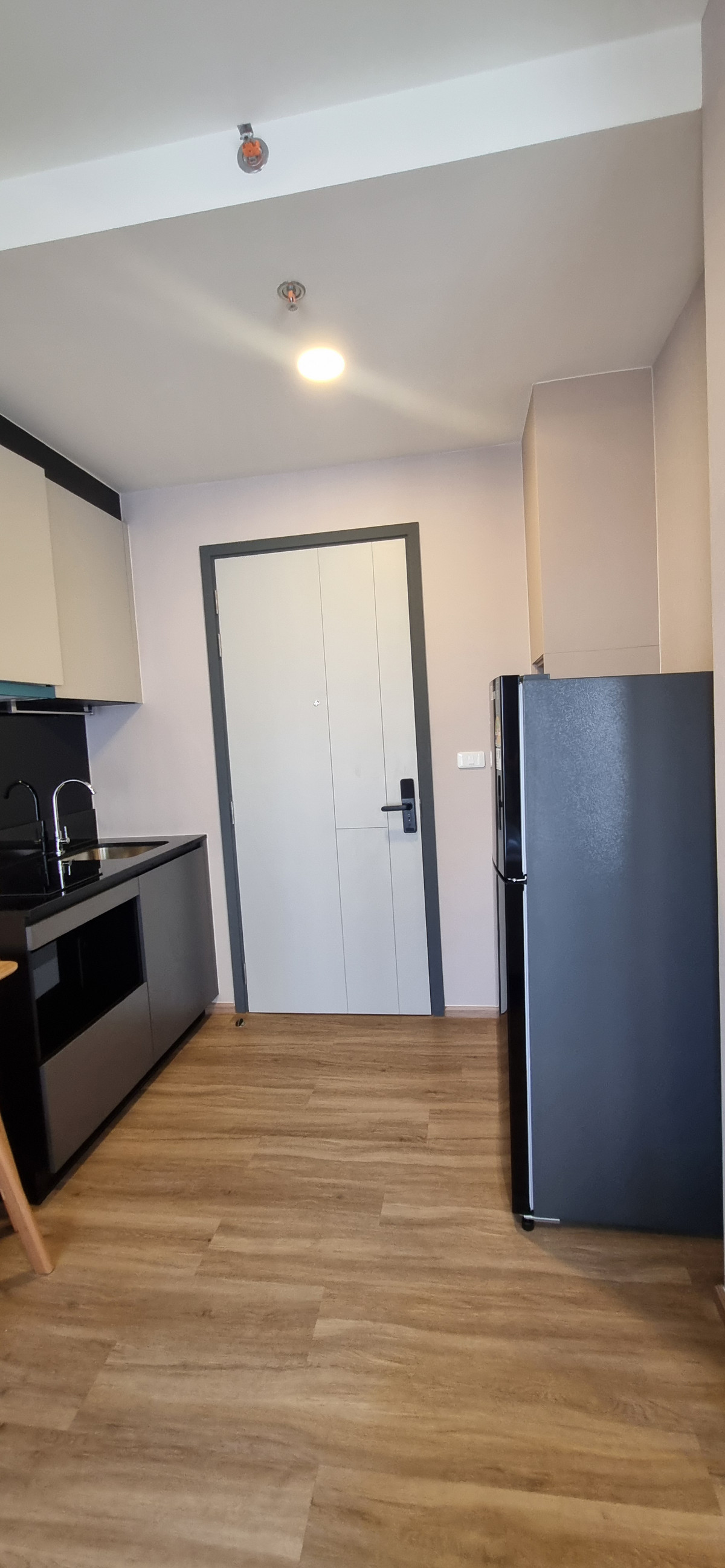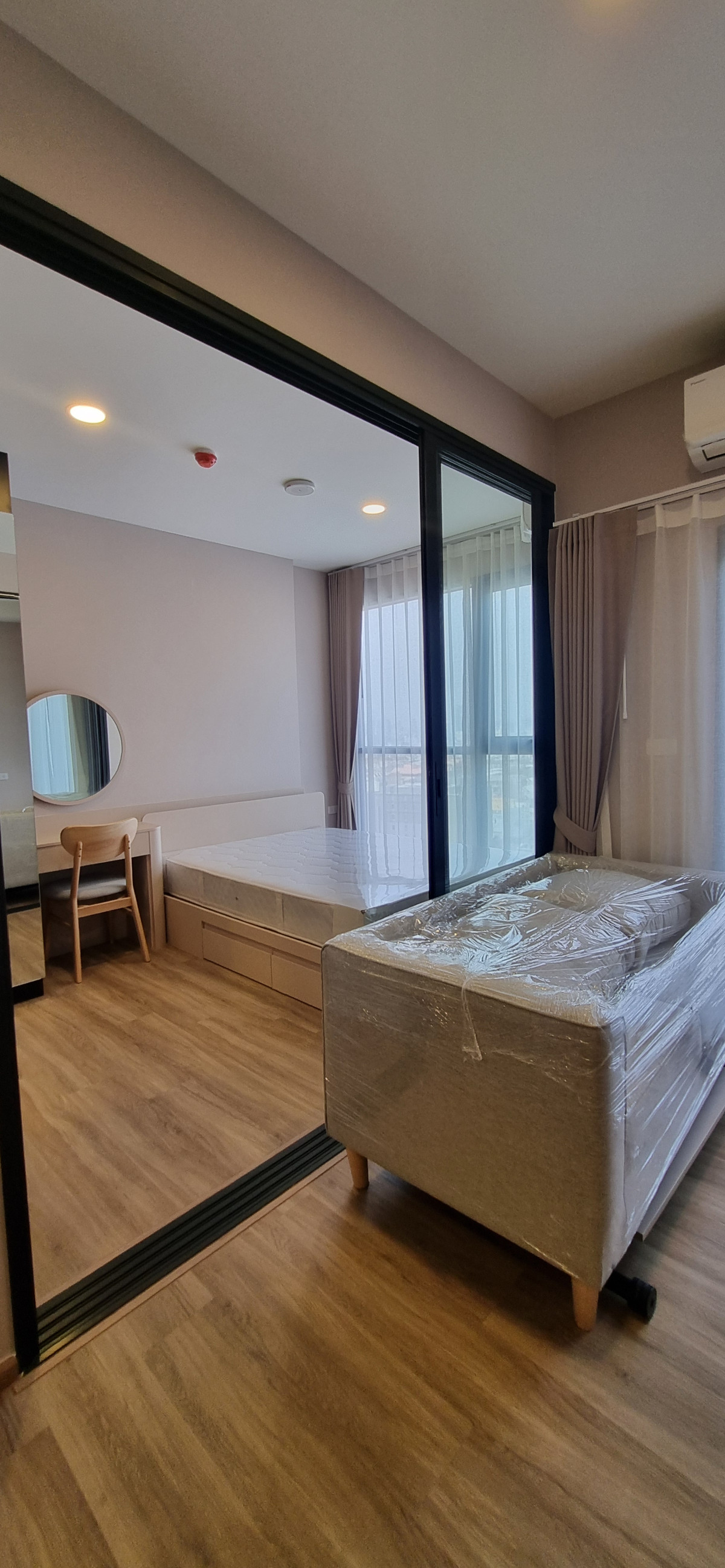 Decorated in Nordic Contemporary Living style, warm, gentle tones, beige, gray, light pink, giving a feeling of elegance, warmth, and airiness with minimalist design wooden furniture. simple lines There arent many patterns. The room receives natural light from large windows + completely blackout curtains. The atmosphere is clean New room, first hand 1 bedroom, size 26.82 square meters 1 bedroom, 1 bathroom, living room, open kitchen Built-in furniture with electrical appliances