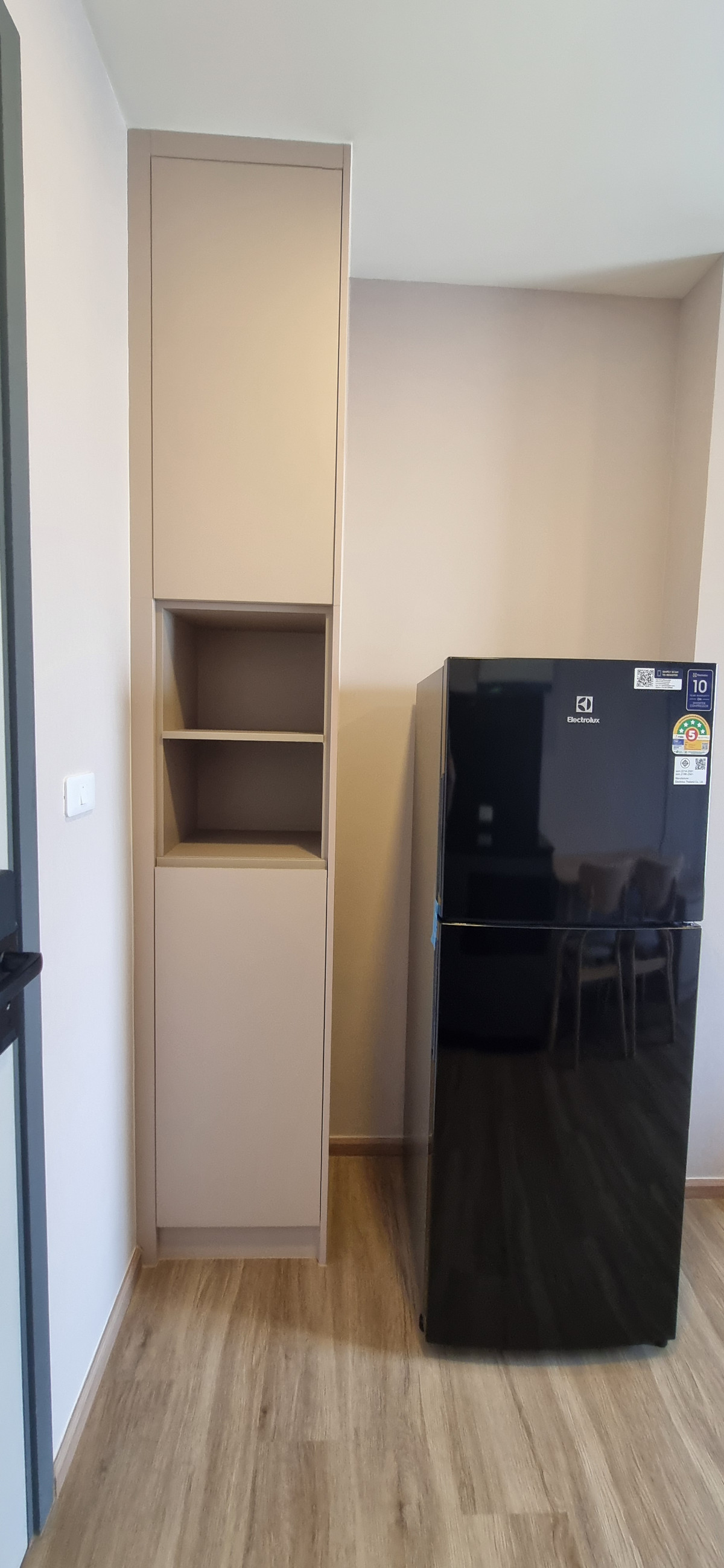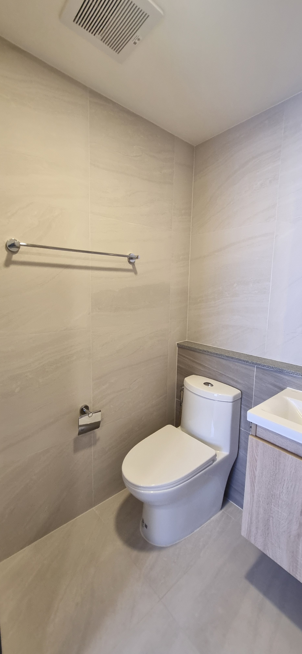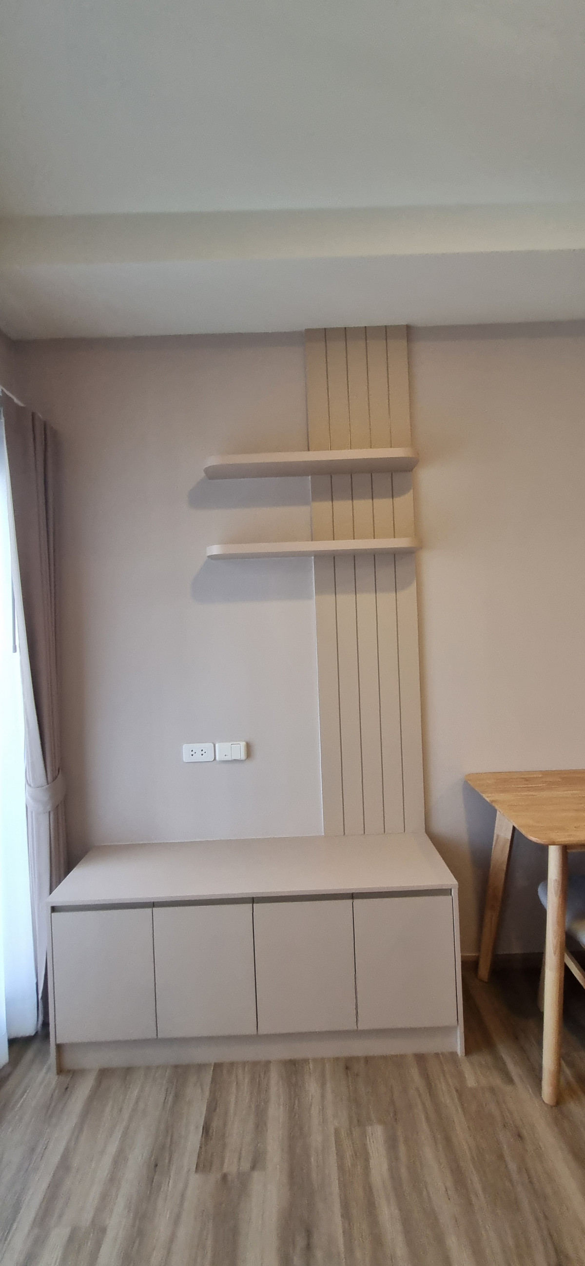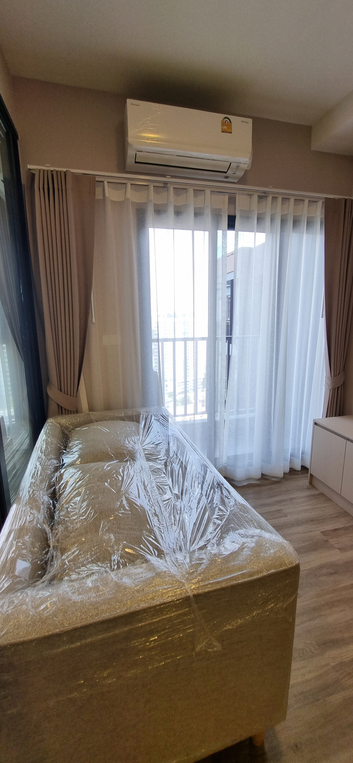 Decorated in Nordic Contemporary Living style, warm, gentle tones, beige, gray, light pink, giving a feeling of elegance, warmth, and airiness with minimalist design wooden furniture. simple lines There arent many patterns. The room receives natural light from large windows + completely blackout curtains. The atmosphere is clean New room, first hand 1 bedroom, size 26.82 square meters 1 bedroom, 1 bathroom, living room, open kitchen Built-in furniture with electrical appliances