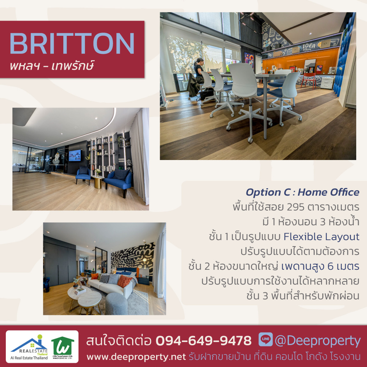 🏡 Energy-Efficient 3.5-Storey Home Office for Sale – Fully Functional with Solar Cell System Perfect for modern businesses seeking a professional image with 6-meter high ceilings. . 🌟 BRITTON 📍 Thepharak 45 – Connecting Phaholyothin – Vibhavadi – Ramintra . ✨ 1st Floor: Flexible layout, ideal for Reception / Showroom ✨ 2nd Floor: Spacious working area with impressive 6-meter ceiling height ✨ Mezzanine: Suitable for Meeting Room / Creative Space ✨ 3rd Floor: Private residential area . 📐 Usable area: 295 sq.m. 🛏 1 Bedroom 🛁 3 Bathrooms 🌿 Bright, airy design with abundant natural light . ✨ Clearly separated functional zones ✨ Master bedroom with walk-in closet ✨ Additional 30 shared parking spaces within the project ✨ Security system . 📍 Near Lak Si Circle and 2 BTS/MRT lines 📍 Close to SCB Park and Government Complex Chaengwattana 📍 Multiple access routes for convenient commuting . 💎 Invest today – ideal for owner-use or rental income Perfect for businesses that value professionalism and strong brand presence ☎️ Freya: Contact number, Contact number 📲 Line: @deeproperty (please include @) 🌍 www.deeproperty.net . #HomeOfficeThepharak, #PhaholyothinProperty, #3Point5StoreyTownhome, #BangkokHomeOffice, #LakSiRealEstate, #OfficeSpaceBangkok, #InvestmentPropertyThailand, #EnergyEfficientBuilding, #SolarCellProperty, #Deeproperty
