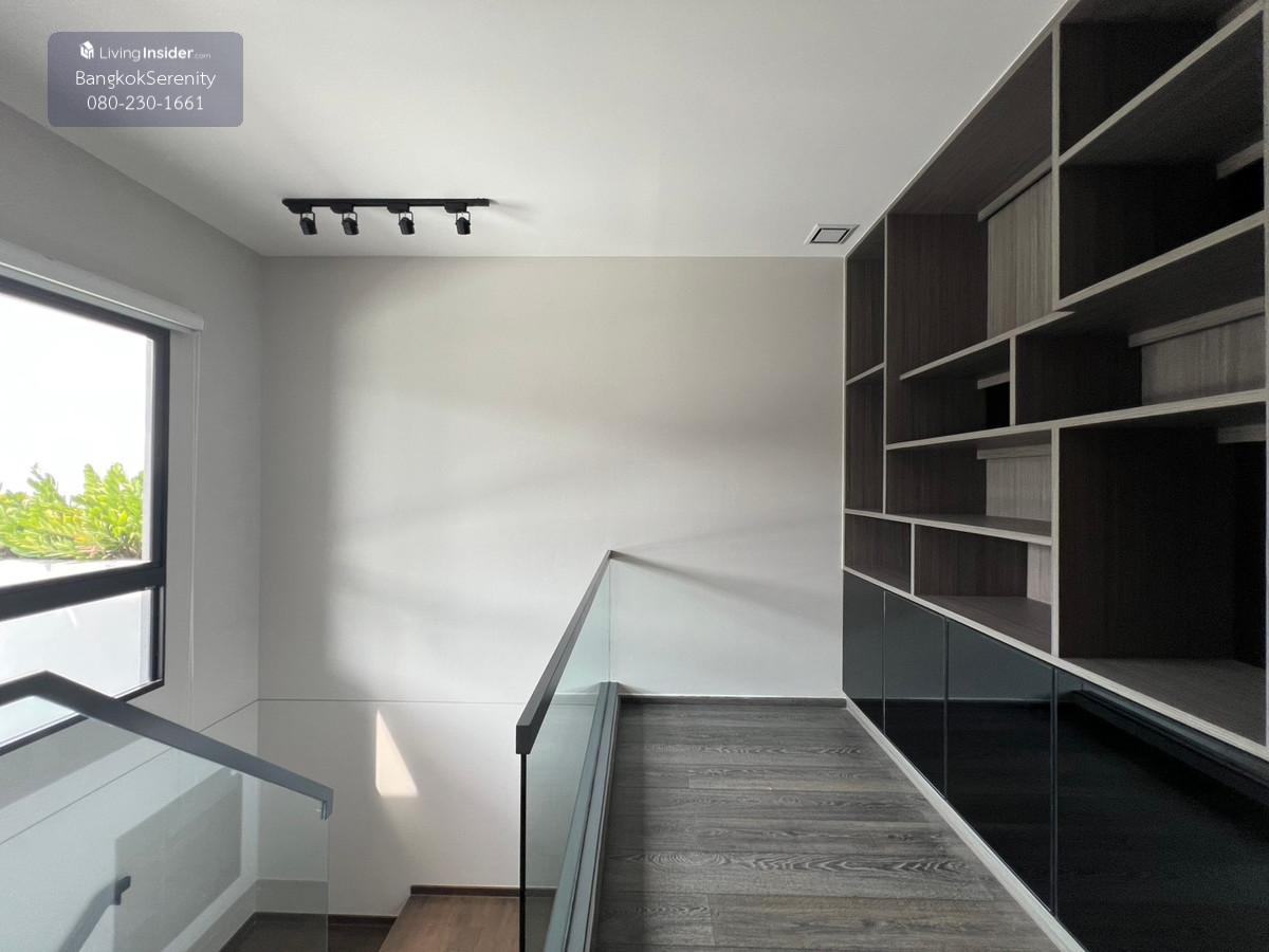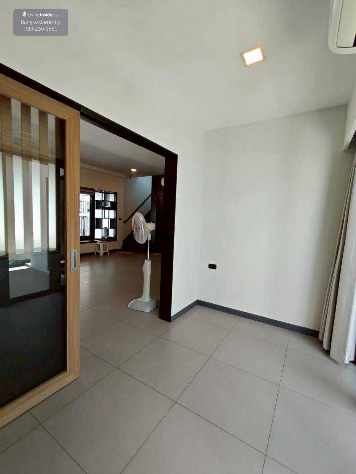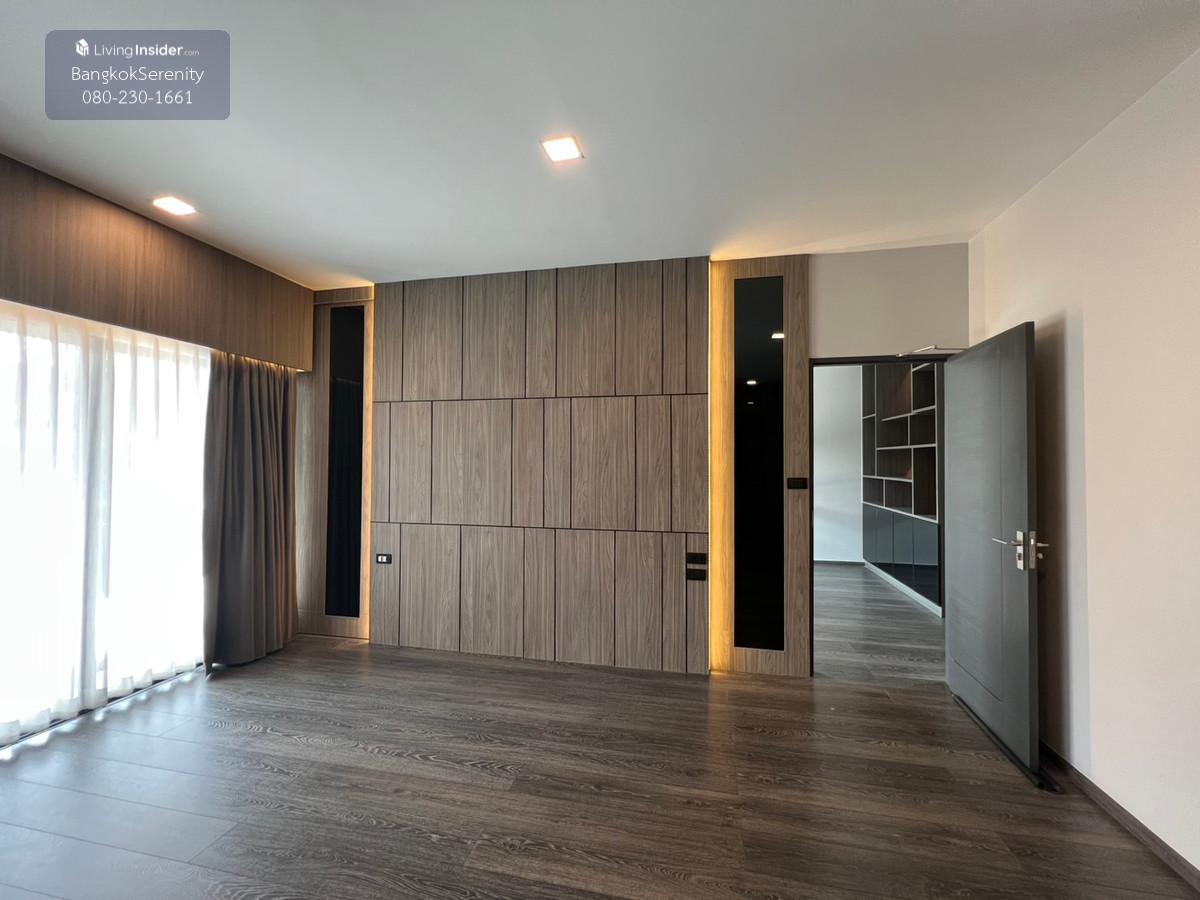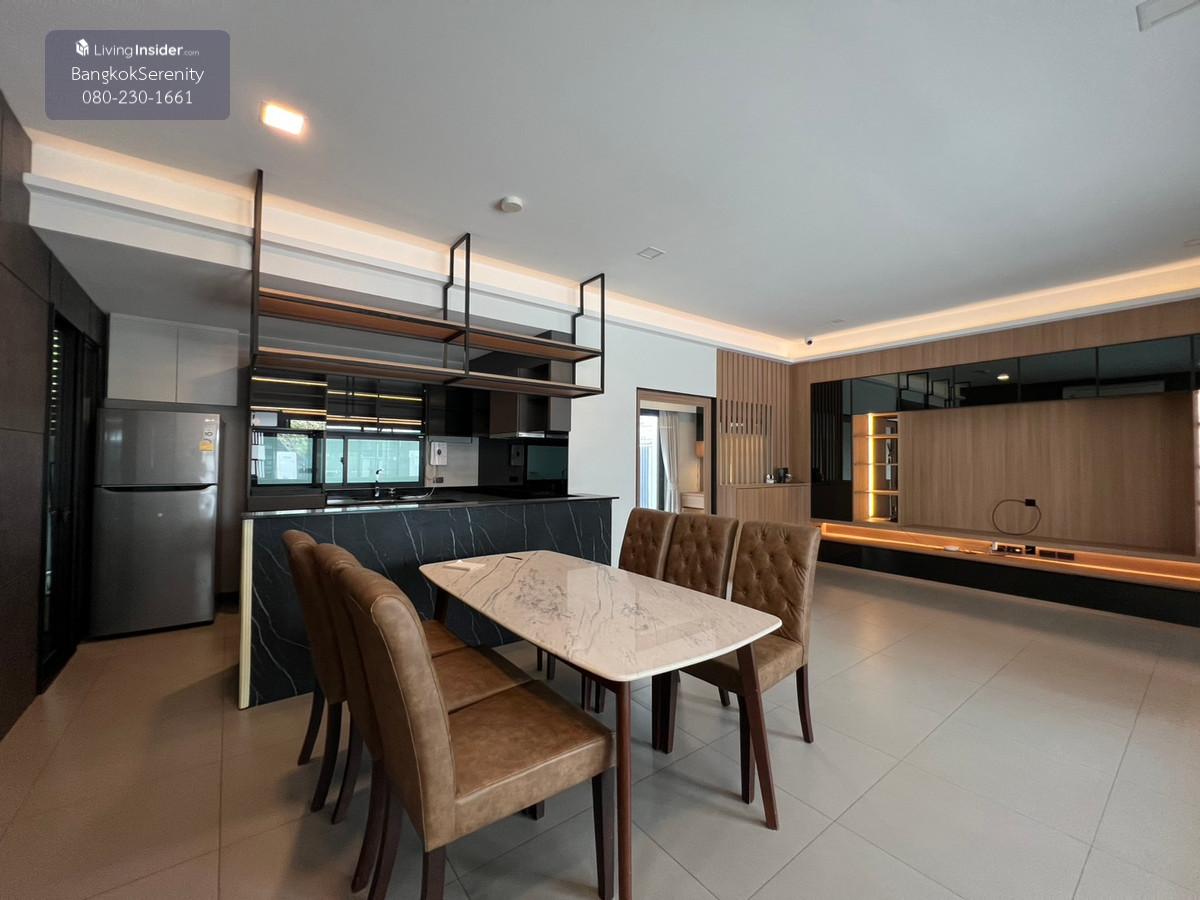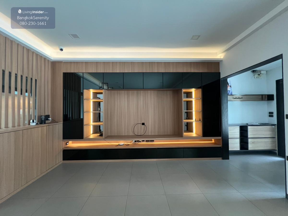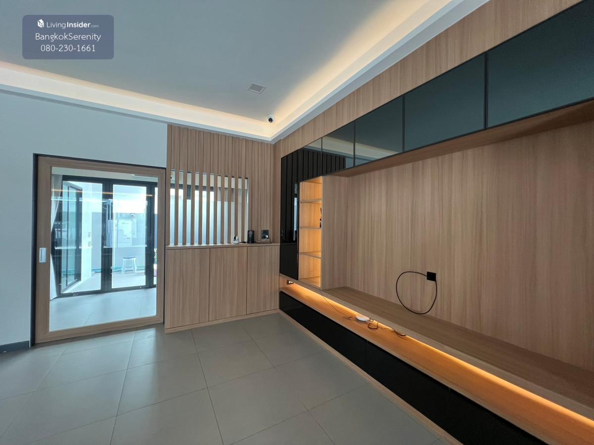 For sale and rent Vive Bangna Km. 7 - Central house facing south - Land size 40 square wah - Usable area 240 sq m - Addition of Thai kitchen in back with gas stove, hood and kitchen counter - Built-in TV shelf, bedroom and kitchen - Rent 75,000 baht per month - Sell for 14.5 million baht (Price negotiable)