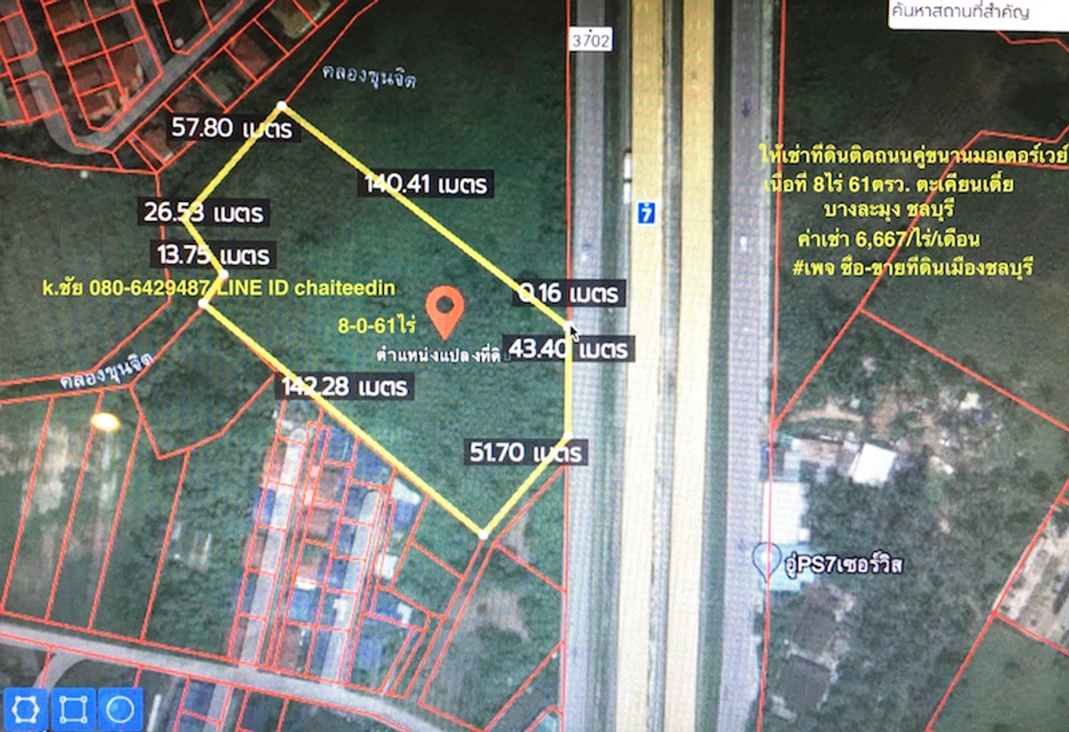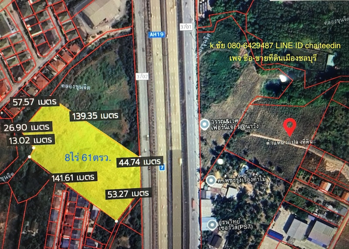 Takhian Tia land for sale, 8 rai, next to the motorway parallel road (7), EEC city plan, light yellow, Takhian Tia Subdistrict. Bang Lamung District Chonburi Province Near Rojana Laem Chabang Industrial Estate Suitable location for development into a warehouse, parking lot, price 6 million per rai. If interested, contact Khun Chai Contact number LINE ID chaiteedin page for buying and selling land in Chonburi.