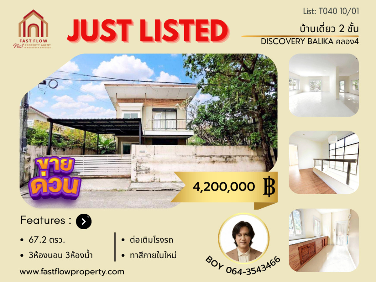 Single house for sale, Discovery Balika Rangsit-Khlong 4. Newly renovated interior, extended garage and multi-purpose room. Located on Sai Pracharat Road, Phra Ong Chao Sai Road, Lam Luk Ka, Khlong 4. Contact: Thanabodee (Boy) Fast Flow Property Contact number Line ID: boykrub15 Listing no: 90157 Property Detail: - 2-story single house for sale in Discovery Balika Rangsit-Khlong 4 project. - House is located in Soi 1, fronting the project fence, providing privacy. - Land size: 67.2 square wa. - Largest house plan in the project. - Usable area 175 square meters, approximately 200 square meters including the garage. - South-facing house with good ventilation. - 3 bedrooms, 3 bathrooms, 1 living room, 1 family room, 1 kitchen. - High-quality kitchen counter extension. - Fish pond built on the property. - Extended garage with covered parking for 2 cars. - Tile/granite flooring on the ground floor, wood-patterned tile flooring on the upper floor. - House sold as is, easy to decorate and renovate. Project and Facilities: - Discovery Balika developed by Tara Property Co., Ltd. - Clubhouse/Fitness center/Public park - Monthly common area fee: 1,100 THB - CCTV and 24-hour security. - Easy Pass access system for entering and exiting the village. Nearby Places: - Beacon House School - Near Yaem Sa-ard Rangsit School, Chokchai Rangsit School - Near Paolo Hospital, Sinphet Hospital, Saimai Hospital - Near Lad Sawai Central Market, A.C. Khlong 4 Market - Near Big C, Lotus, HomePro, Market Village Khlong 4 - Near BTS Green Line, Kukot Station, Kanchanaphisek Ring Road, Lam Luk Ka Road, Rangsit-Nakhon Nayok Road Location: https://maps.app.goo.gl/bMau1QXc9mjgYiaS9 Price: 4,100,000 THB Free bank loan assistance! Viewing available daily. Interested? Price is negotiable. Contact: Mr. Thanabodee (Boy) Contact number Line ID: boykrub15 Contact Fast Flow Property Office Tel: Contact number Line id: @fastflow FB page: facebook.com/fastflowproperty www.fastflowproperty.com We offer free advertising for all types of real estate sales and listings.