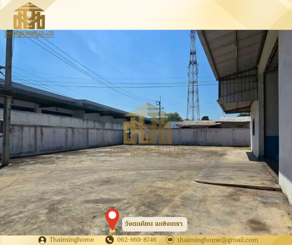 Warehouse/Factory for Rent, 500 sq.m., Wang Takian, Chachoengsao (Property Code TW4-1600226) Details - Total area 1.5 rai - Has a factory license (Form 4) - 3-phase factory electricity - 500 KVA transformer - Located in an orange zone (residential/commercial) - Warehouse 500 sq.m., 7-meter high ceiling, floor load capacity 2 tons per sq.m. - 2-story office with partitioned workspaces, 90 sq.m., with restroom - Easy access for large trailer trucks - Parking available for more than 20 vehicles around the warehouse Nearby Places - SCG Boonthavorn Chachoengsao (0 km) - 7-11 (500 m) - Makro Chachoengsao (2.9 km) - Robinson Chachoengsao (7.5 km) - Wat Sothon (7.7 km) - Lotus Chachoengsao (11 km) - Suvarnabhumi Airport (52 km) Rental Conditions - Minimum 1-year contract - 3-month security deposit - 1-month advance payment - Rental price: 70,000 THB per month --------------------------------- บริษัท ไทยหมิง โฮม จำกัด Thaiming Home Co.,Ltd. 泰明房园 房产公司 ----------------------- Contact ติดต่อ : Contact number Contact : Contact number คุณหมิง(中文) Line ID: thaiminghome Line ID: @thaiminghome https://lin.ee/PkkHwYv Wechat : ThaimingHome E-mail : Contact email -----------------------