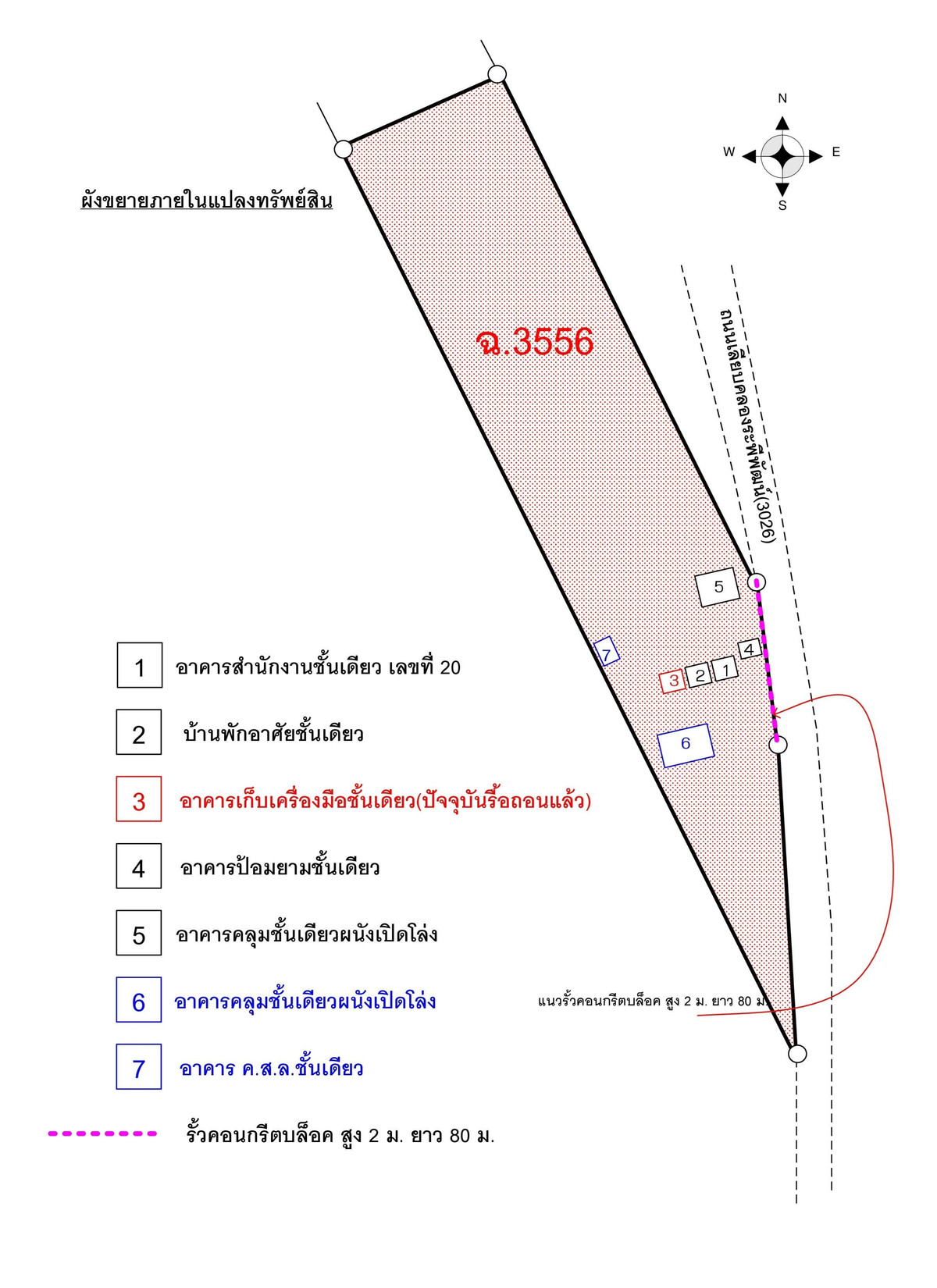 Property Highlights Land Title Deed (Chanote): No. 3556 Total Area: 14 Rai, 3 Ngan, 85 Sq. Wah (approx. 23,940 sq. meters) Dimensions: Width 185 m x Depth 410 m Buildings & Improvements Office Bui