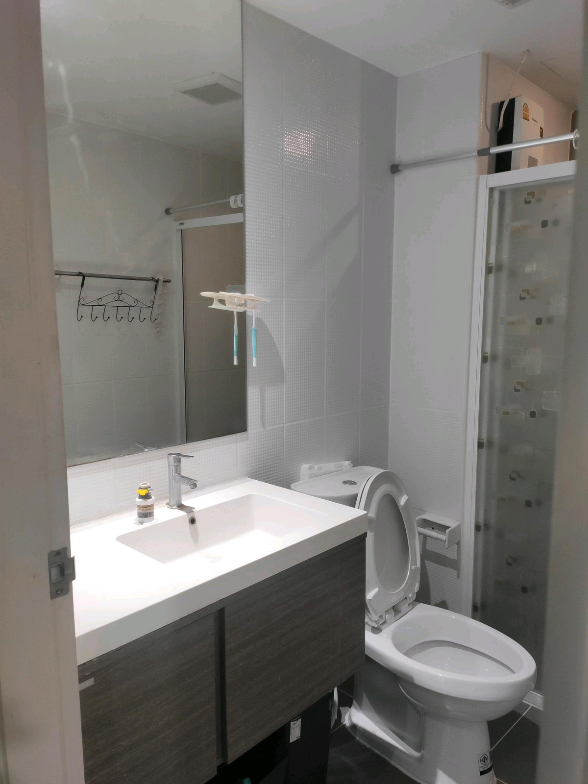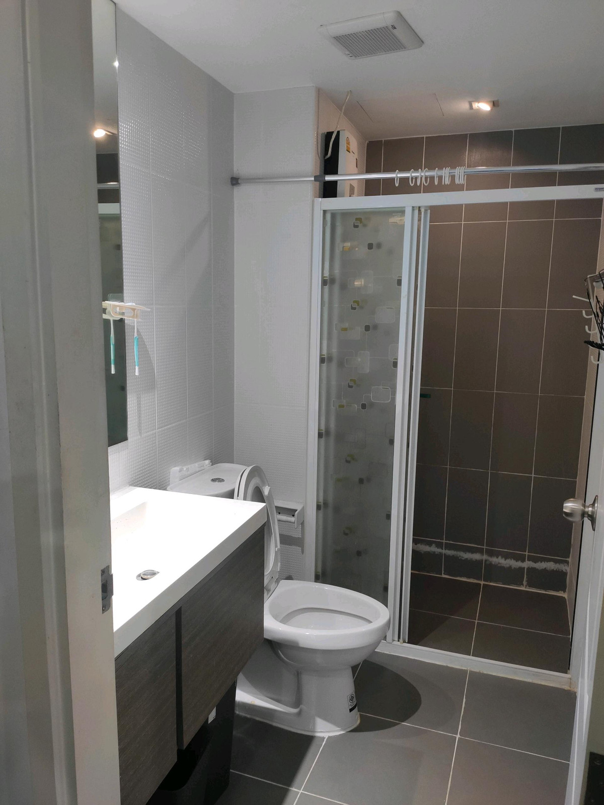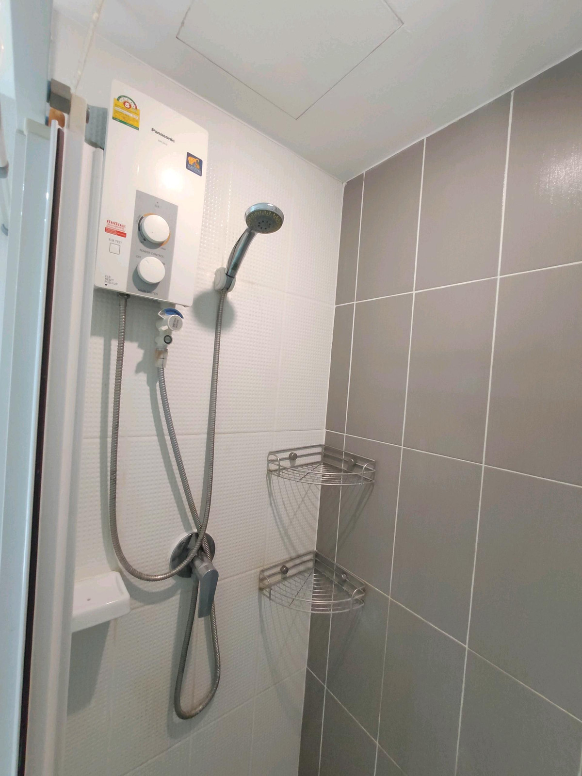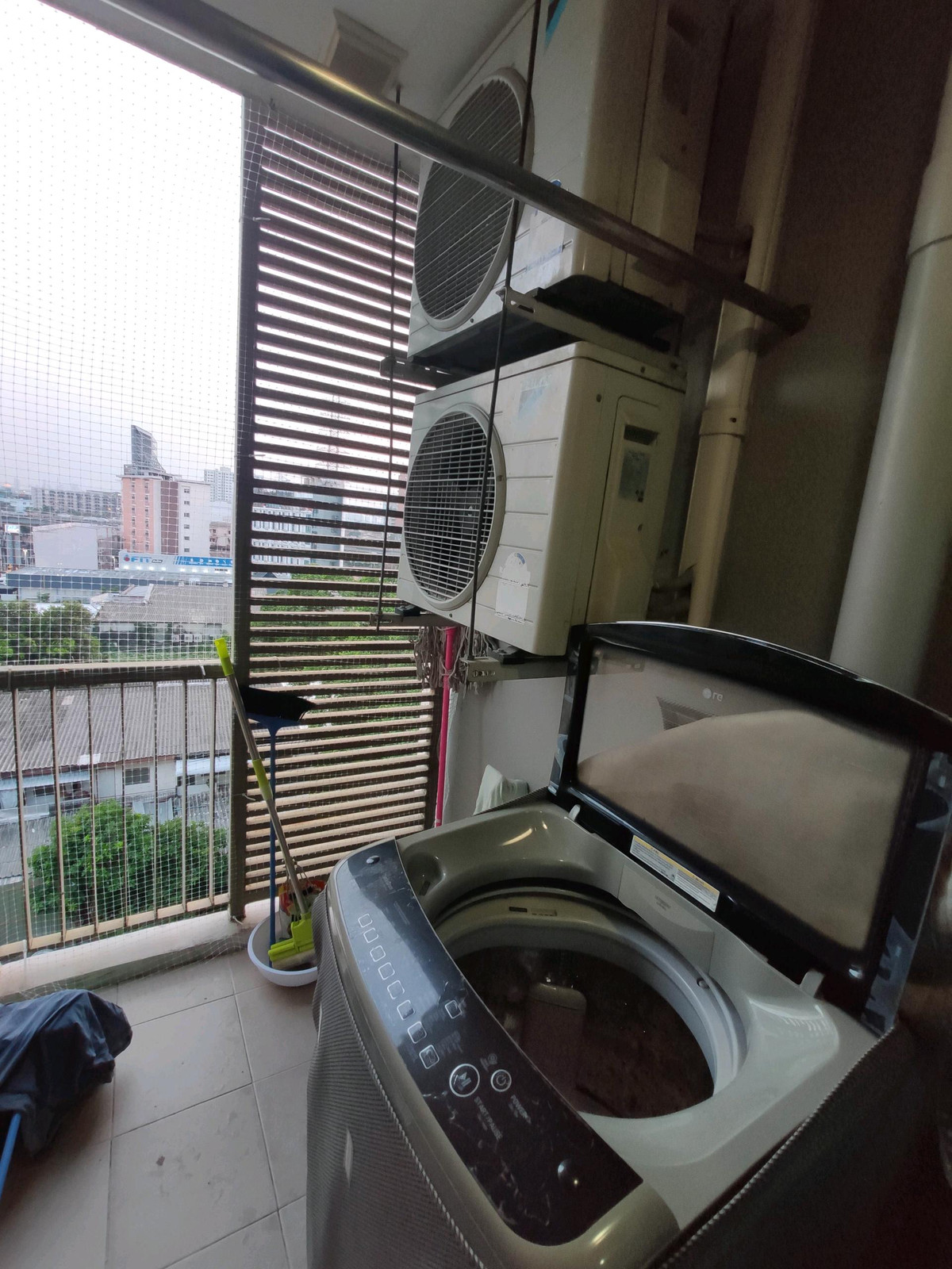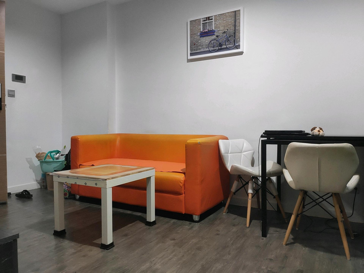 Details of the suite 7th floor, room size 32.50 square meters 1 bedroom, 1 bathroom, 1 kitchen, 1 living room Furniture - 5 foot bed with bedside table - 2-layer curtains - Wardrobe - Sofa with table - Built-in TV shelf - Built-in kitchen set with storage cabinets - Storage cabinet in front of the bathroom - Built-in Enkrasong cabinet - 3 shelves - Dining table with 2 chairs Electrical appliances - 2-door refrigerator, size 7.9 cubic feet - Water heater in the bathroom - 2 air conditioners - Microwave - Top-loading washing machine