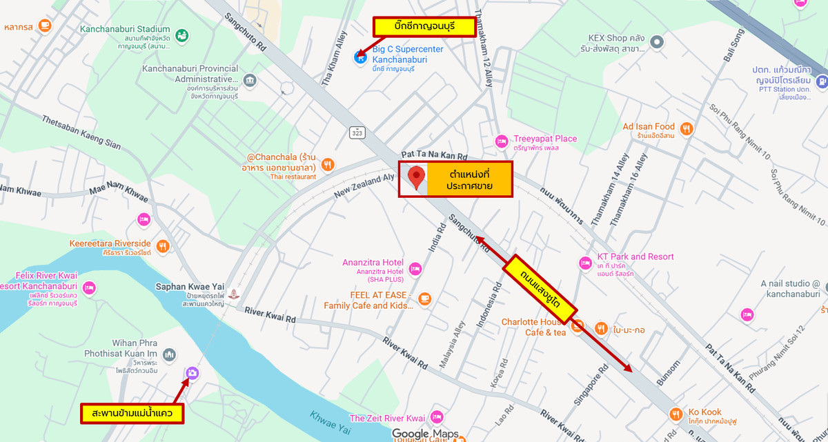 Prime commercial location! In the heart of Kanchanaburi city! For sale: Land with garden house, 189 sq.wah, pink zoning, frontage on 2 roads!! Located on Saeng Chuto Road near the intersection to the Bridge over the River Kwai, Kwae Yai Road. Width 16 meters, excellent price!! . Location: Saeng Chuto Road (Highway 323), Ban Tai Subdistrict, Mueang Kanchanaburi District, Kanchanaburi Province https://maps.app.goo.gl/5hTYH3qAVdB2B7bi8 . Details ✅ Land area 189 sq.wah ✅ Rectangular plot, width 16 meters, depth 47 meters, road frontage on 2 sides Front side directly on Saeng Chuto Road, near the intersection leading to the Bridge over the River Kwai (Pink zoning) ✅ Existing single-storey house and backyard garden area ✅ Very convenient access, prime city-center location suitable for various businesses, parking available in front ✅ Suitable for development as: 1. Retail shop, café, restaurant with residential space 2. Convenience store with parking area . ✅✅ For sale as a whole plot at only 16,900,000 Baht (approx. 460,000 USD / 3,314,000 RMB) Price below current market value and negotiable . Nearby locations ✅ Saeng Chuto Road ✅ Kwae Yai Road ✅ New Zealand Soi ✅ Bridge over the River Kwai ✅ Big C Kanchanaburi . For viewing or more information, please contact: Khun G: Contact number Line ID: champ528 Line ID: @thpropertyinvestor (include @) Website: [www.thaipropertyinvestor.net](http://www.thaipropertyinvestor.net)