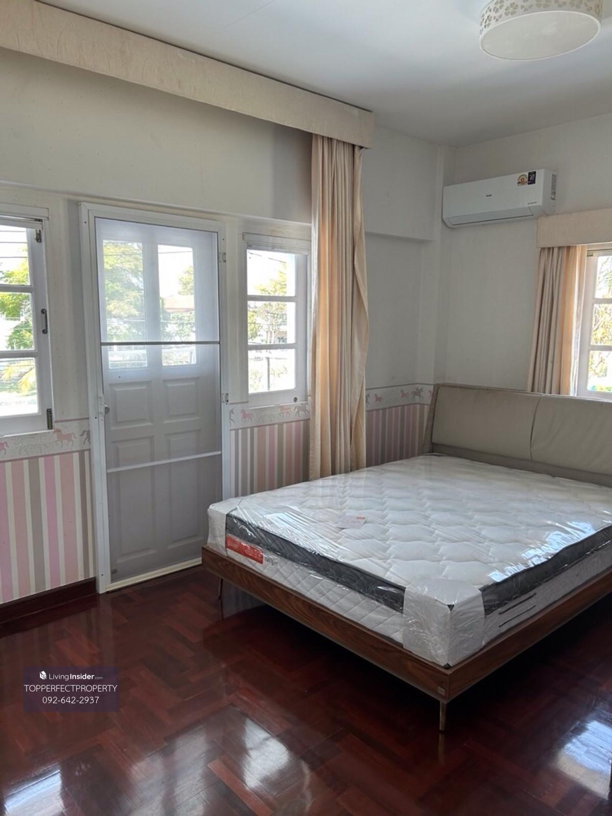 2-story detached house, Perfect Place, Ramkhamhaeng 164, Colonial, 5 bedrooms, 6 bathrooms, excluding maids room, 1 large kitchen, area 127 square meters, usable area 222 square meters, next to RIS International School, newly decorated, never had a tenant. Ready to move in immediately. Convenient travel Near Minburi Market Pink Line and Orange Line Rent 120,000 baht per month Rent, 2 year contract, price 110,000 baht per month. If interested, contact Contact number or Contact number.