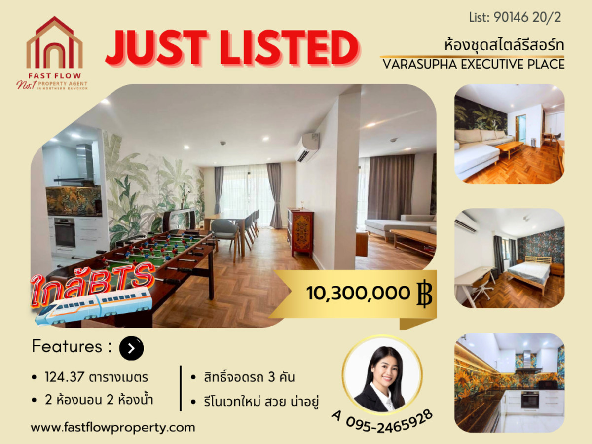 Resort-style condo for sale, 124.37 sq m, behind Phayathai 2 Hospital, 3 parking spaces, newly renovated. Near BTS Sanam Pao and BTS Ari. Varasupha Executive Place Condo, Soi Phahonyothin 1, near Victory Monument. Interested, please contact: Ms. A - Araya, Fast Flow Property Tel: Contact number, Contact number Line: @fastflow Listing No. 90146 Room Detail: - Condo for sale, 6th floor, Varasupha Executive Place (Soi Phahonyothin 1) - Near BTS Green Line, Sanam Pao Station, easily accessible on foot (250 meters). - Usable area 124.37 sq m. - Newly renovated throughout. Built with high-quality materials: - 2 bedrooms, 2 bathrooms - Large, separate kitchen with high-quality granite countertops - 2 large balconies, perfect for picnics - Resort-style swimming pool view of the project - Soundproof doors and windows - Large living room - Dining room - Storage room with high-quality built-in cabinets - Sold with some furniture And electrical appliances include: - Bosch dishwasher, induction hob, and clothes dryer - 4 Daikin air conditioners - Parking rights for 3 cars (1 fixed and 2 freestanding) - Monthly pest control package paid until January 2027 Project and Facilities: - 8-story low-rise condo with a resort atmosphere - Access from both Phahonyothin Soi 1 (Soi Luecha) and Phahonyothin Soi 3 - Swimming pool, fitness room, hair salon - 24-hour security system with CCTV - Common area fee: 40 baht per square meter per month Nearby Places: - Located behind Phyathai 2 Hospital - BTS Sanam Pao (with a shortcut from the BTS station to the condo in just 250 meters) - Phahonyothin Expressway entrance Without having to go out onto the main road: - SM Tower office building, Channel 5 TV station - The Seasons Mall - Phyathai 2 Hospital (only 300 meters walk), Vimutti Hospital, Rajavithi Hospital, Phramongkutklao Hospital - Samsenwittayalai School, University of Thai Chamber of Commerce Project Location: https://maps.app.goo.gl/CMuLMQquKqtCrEoo8 Price: 10,300,000 THB Free assistance with bank loan arrangement! Viewing appointments available daily. Interested? Price is negotiable. Contact: Ms. A - Araya, Fast Flow Property Tel: Contact number, Contact number Line: @fastflow Contact Fast Flow Property Office Tel: Contact number FB page: facebook.com/fastflowproperty www.fastflowproperty.com We offer free advertising for all types of real estate sales and listings.