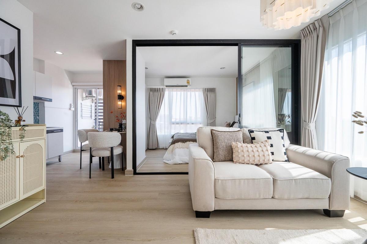 Room details • 1 bedroom, 1 bathroom • Size 29.17 sq m • Corner room with skylights on 2 sides • A large mirror fills the entire wall. Receive full natural light• Panoramic view of the city and the Purple Line • Perfect function, airy, open, not uncomfortable • Parking for 1 car Facilities Reception hall, mail room, salt-water swimming pool, fitness, recreational garden, passenger elevator, key card system, CCTV and 24-hour security Highlights • Rare corner room, open view on 2 sides • Can clearly see the Purple Line • Good size, suitable for First Jobber or buying to live in yourself • Location near the BTS and government agency zones. Easy to rent Designed and decorated by Khun Piano If interested, contact Contact numberLine: @bestlivingcondo