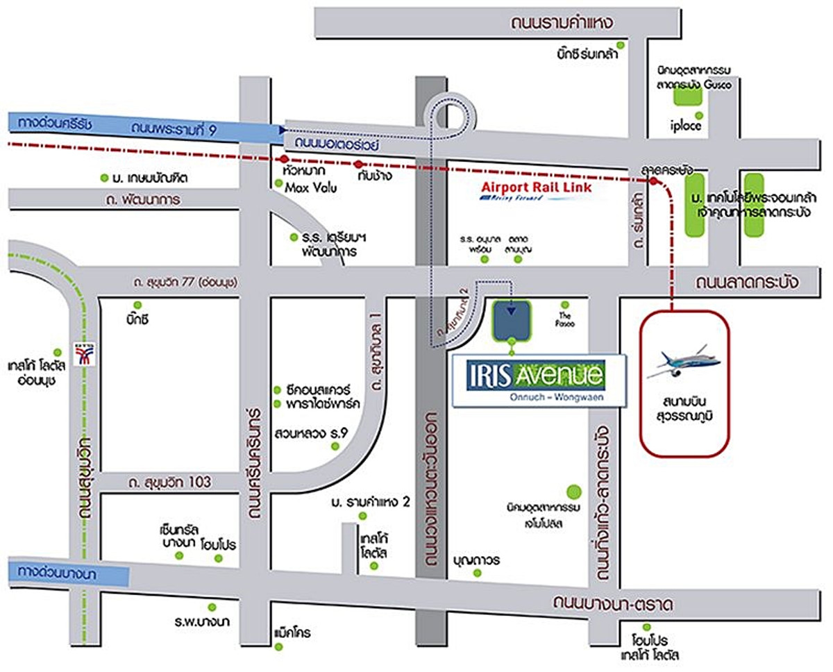 For Rent Condo Iris Avenue Onnuch-Lat Krabang Near Suvarnabhumi Airport 28 sq.m 8th floor Building 2, Fully furnished, Ready to move in . Location : - Near Airport Rail Link Lat Krabang Station - Near