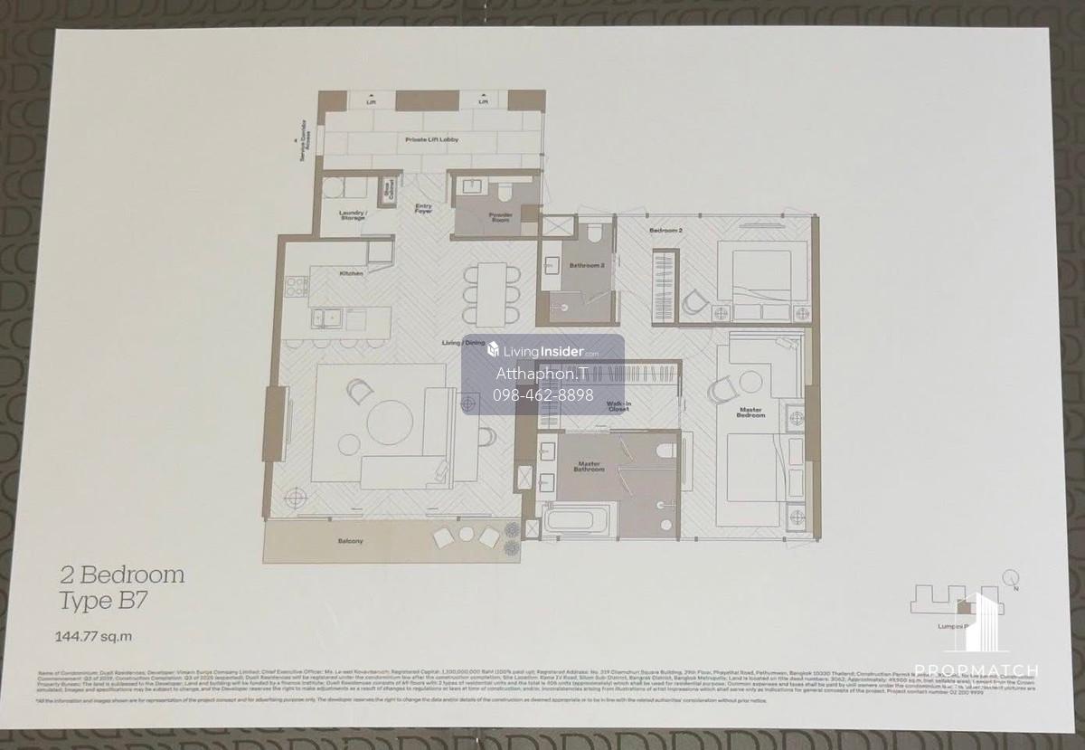 Dusit Residences & Dusit Parkside ✨ Grand Luxury 2-Bedroom Residence • Type B7 • 2 Bedrooms / 2 Bathrooms • 144.77 sq.m. • Selling Price: THB 63,000,000 A generously sized 2-bedroom layout offering expansive living and dining areas, ideal for refined city living. Located in a prestigious branded residence with premium facilities and hotel-level services in Bangkok CBD. Perfect for discerning homeowners or luxury investors. Contact for private viewing and full details. Tel. Contact number Bank