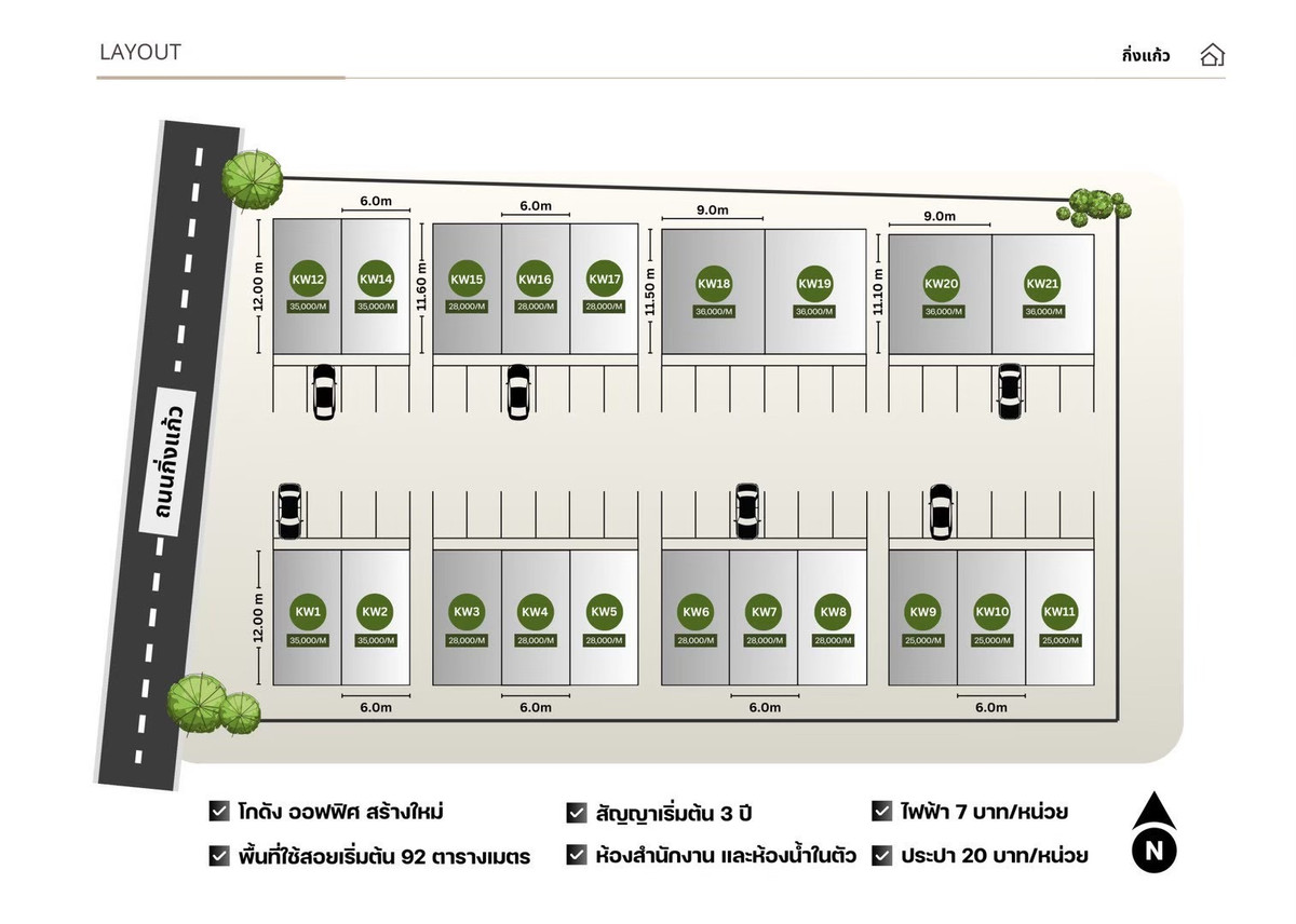 📍โซนกิ่งแก้ว บางนา ให้เช่า โกดัง + ออฟฟิศ ดีไซน์ทันสมัย มี ระบบรักษาความปลอดภัย (Security) ครบวงจร กิ่งแก้ง40/2 ติดถนนใหญ่ เริ่มต้น ห้องละ25000/เดือน สตูดิโอ 1 ห้องน้ำ - บ้าน ถนน กิ่งแก้ว, บางพลีใหญ่, กรุงเทพมหานคร, สมุทรปราการ 10540, ประเทศไทย 📍 กิ่งแก้ว | โกดัง+ออฟฟิศ ให้เช่า ✨ มีขนาดตั้งแต่ 92 - 100 ตรม. 𝗟𝗼𝗰𝗮𝘁𝗶𝗼𝗻 : 🚏(ติดถนนกิ่งแก้ว, ใกล้ถนนบางนา - ตราด, สนามบินสุวรรณภูมิ) 🚧โกดังสร้างใหม่พร้อมออฟฟิศ+ห้องน้ำในตัว แล้ว 1 มีนาคม 2569 เปิดจอง‼️ 𝗥𝗲𝗻𝘁 : 25,000 THB/ Month (ว่าง 3 ยูนิต) 𝗥𝗲𝗻𝘁 : 28,000 THB/ Month (ว่าง 9 ยูนิต) 𝗥𝗲𝗻𝘁 : 35,000 THB/ Month (ว่าง 4 ยูนิต) 𝗦𝗶𝘇𝗲 : 92 ตารางเมตร (6*12) 𝗥𝗲𝗻𝘁 : 36,000 THB/ Month (ว่าง 4 ยูนิต) 𝗦𝗶𝘇𝗲 : 100 ตารางเมตร (9*11.10) • สามารถทำ cafe,studio,สำนักงาน, จดทะเบียนบริษัทได้ • ไฟฟ้า 7 บาท / หน่วย • ประปา 20 บาท/หน่วย 🚗 ที่จอดรถ/พื้นที่จอดรถ : 2 📑 จดทะเบียนพาณิชย์ : อนุญาต ✍🏻สัญญาขั้นต่ำ 3 ปี | ล่วงหน้า 1 เดือน + มัดจำ 2 เดือน Contact number ( ตาล) ID : sugarfr33 https://line.me/ti/p/96llkRas9P