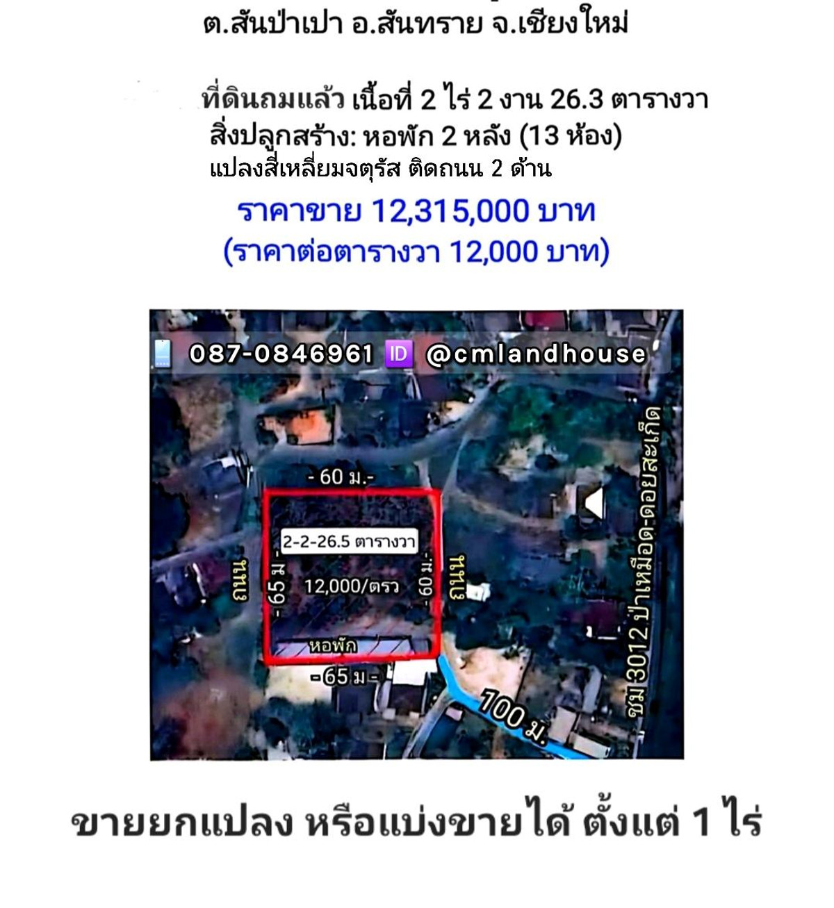 Land for sale 2-2-26 rai, 12,000 per square wa, plus free dormitory, 13 rooms, full tenants , near Central Festival, 10 km., near Bo Hin Market. Near San Pa Pao Municipality San Sai District near Chiang Mai-Doi Saket Road, only 800 m. 🔆Selling cheaper than other plots (in this area, 13,000+ sq m) 🔆 Can be divided and sold from 1 rai or more ________________________ 🚩 Land title deed 2-2-66 rai Square plot approximately 65*65 m. Land filled in for more than 20 years Electricity, water, internet access Land next to public roads on 2 sides There is a drainage pipe 🎉 Free, 2 one-story dormitories with 13 rooms, room size 3.5×6 m. Rent 1,500/month, always full with tenants *Can increase the room rate * Sell only dormitories 226 sq m. Price 3,800,000 baht Selling for 3,800,000 baht________________________ 💗 Suitable for dividing plots for sale, building a house for sale , making it a health center for the elderly. Build a garden house - in the middle of the community, near a school, temple, health station , there are shops, restaurants, coffee shops, near a gas station Near the fresh market, flea market, etc._________________ Location: San Pa Pao Subdistrict, San Sai District, Chiang Mai Province - Near San Pa Pao Municipality 500 m. - Near Bo Hin Market 3 km. - Near Central Festival 10 km. - Near the main road, Chom 3012, just 100 m. - Near Chiang Mai-Doi Saket Road, 800 meters Make an appointment 1 day in advance. Happy to take you to see 🚫Do not inform the location if you dont make an appointment __________________ Make an appointment to see in advance by phone and Line 🆔️ @cmlandhouse 📱 Contact number #Land for sale in Chiang Mai #Empty land for sale #Second-hand house in Chiang Mai #garden house #agricultural garden #house for sale in Chiang Mai #land for sale #garden for sale #retirement house #dormitory for sale #house review