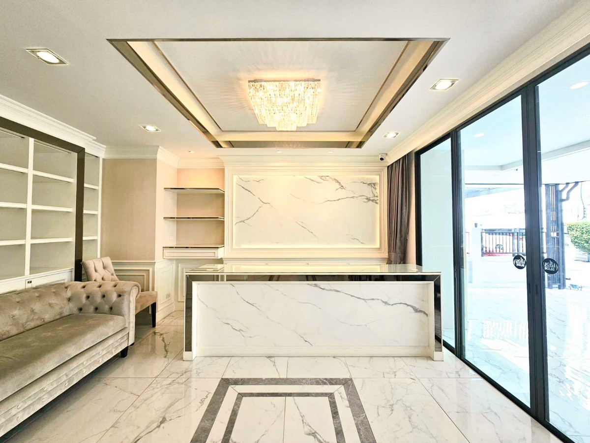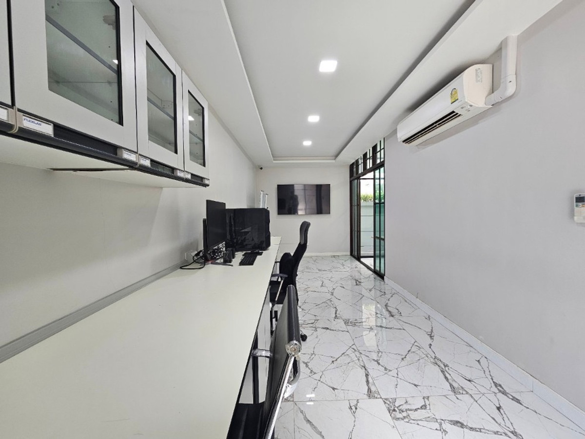 Home office is ready to move in. Built-ins on every floor, fully decorated, very good price. Anyone who lives along the road and needs an office, would recommend. Very new condition 99.99% in front of the District project. Ekkamai-Ramintra (DISTRICT EKKAMAI-RAMINTRA) 📍Usable area 510 sq m Area size 52.70 sq m 4-story twin building, width 14 meters, depth 12 meters 📍Decoration: 4-story twin building, decorated, ready to move in. Complete with furniture set, lighting system, air conditioning system, LAN system (internet installed and ready to use), there is Wi-Fi inside the building and there are CCTV cameras that can be viewed through mobile phones. Built-in on every floor. Additions include parking, staff rooms, small lab rooms, 4 conference rooms, every piece of furniture made to order. Lights ordered from abroad Imported marble Specially designed interior, 4th floor can be used as a residence as well. Because when I bought this place, it was a Bareshell style, so I had to redecorate it all ⭕1st floor 1 showroom, 2 work rooms, 1 Lab room, 1 kitchen, 1 storage room, 1 bathroom, 1 large 4-way air conditioner / 3 small air conditioners Parking in front of the building for 4 cars ⭕2nd floor 1 large meeting room, 2 small meeting rooms, 1 bathroom, 1 4-way air conditioner Large air conditioner / 2 small air conditioners ⭕3rd floor 1 large conference room, 1 office room, 1 bathroom, 1 storage room, 1 large 4-way air conditioner / 1 small air conditioner ⭕4th floor 1 large bedroom Ensuite bathroom, 1 small bedroom, ensuite bathroom, 2 air conditioners ⭕Nearby places : -Phayathai Nawamin Hospital 4.8 kilometers -Nawawet Hospital 3.9 kilometers -KPIS International School 3.9 kilometers -Regent International School 10 kilometers -Central Eastville 6 kilometers -Fashion Island 9.0 kilometers - The Crytal 5 kilometers -Satri Wittaya 2 School 6 kilometers ⭕Travel : -Nuanchan Road -Nawamin Road -Kaset-Nawamin Road -Ram Inthra-Ekamai Expressway -Prasert Manukit Road ⭕BTS: Pink Line (Ramintra Km. 6 Station), get off in front of Soi Ramintra 40 ⭕Facilities: -Park -CCTV -24 hour security If interested, contact Contact number