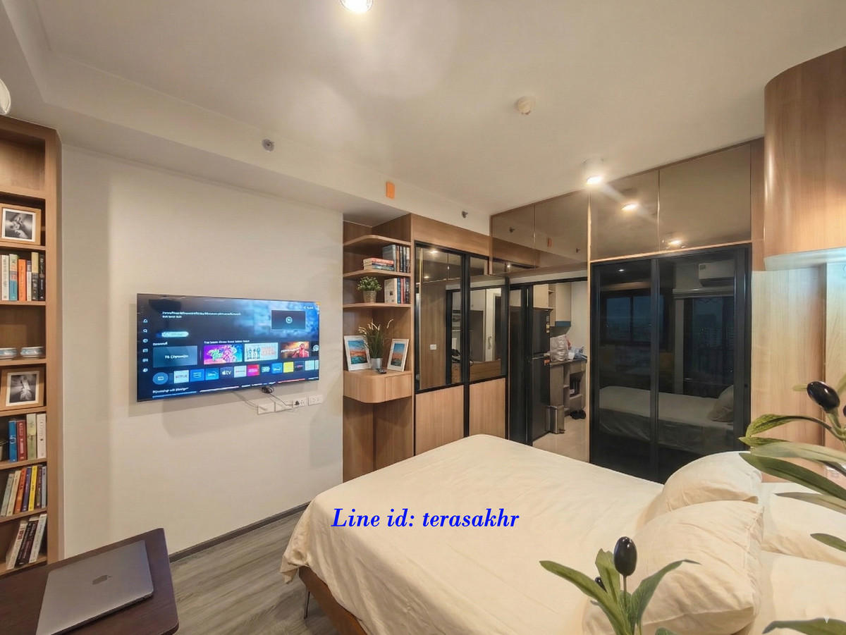 Studio room for rent, 24.8 sq m., open view, 19th floor, south facing, not exposed to the sun, beautifully decorated, complete with equipment and additional storage cabinets. Living or working corner Supports long-term living, only 13,000 per month - Bedroom (1) 5 foot queen bed with mattress cover. No bedding and bedsheets provided (2) 50-inch smart TV mounted on the wall (3) blackout roller blinds to protect against UV and wooden blinds (4) full-to-ceiling wardrobe for additional storage space and (5) dressing table with chairs (6) built-in living corner by the window with shelves (7) adjustable folding table and folding chairs - balcony with 11 kg washing machine and foldable clothes rack attached - The kitchen has sliding glass doors to help reduce odors and noise, complete with (1) kitchen counter with stove/hood and microwave, 14.5 cubic feet refrigerator, (2) shoe storage cabinets - bathroom with built-in glass cabinet for storage. With water heater Facilities within the condo - Large fitness center open 24 hours - Large swimming pool With a childrens pool - Meeting room - Face scanning system for entering and exiting the building and elevator locking floors with guards 24 hours a day - 3 minutes walk to the Yellow Line (180 m.) Future Lamsalee Interchange, Orange, Yellow, opening next year 13,000 baht per month, 1 year contract, 2 months security deposit and 1 month advance rent Accepting only Thai people (Thai only) If interested, contact Khun Tee (owner) Line id: terasakhr Tel.: Contact number *Note Decorations are used for photography purposes only.