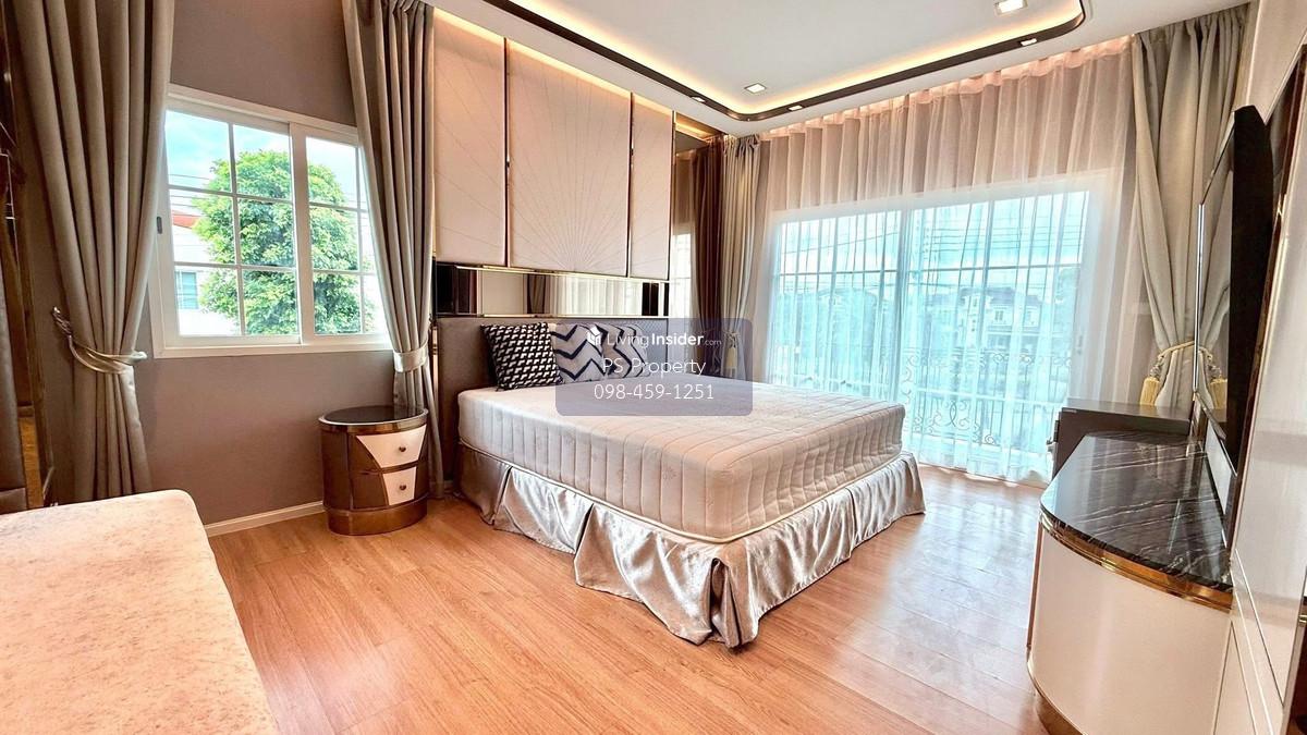 Price: 130,000 baht / month Usable area: 264 sq.m. Area: 60 sq.w. Floor: 2 3 bedrooms / 4 bathrooms / 1 living room / 2 parking spaces Amenities: CCTV, key card Access, fitness center, swimming pool, 24/7 security guard, co-working area, common area. Furniture included: TV, microwave, sofa, refrigerator, bed, air conditioner, water heater, Smoke Dispenser, shelf, TV cabinet, wardrobe, center table. House for rent! convenient transportation, near BTS, near the expressway, fully furnished Ready for viewing. Interested please contact: 📞Call center: Contact number 📱Hotline: Contact number 📲Whatsapp: Contact number 🖱️Line: @psproperty https://lin.ee/d8bpOBs Website: https://www.ps-property.co.th/