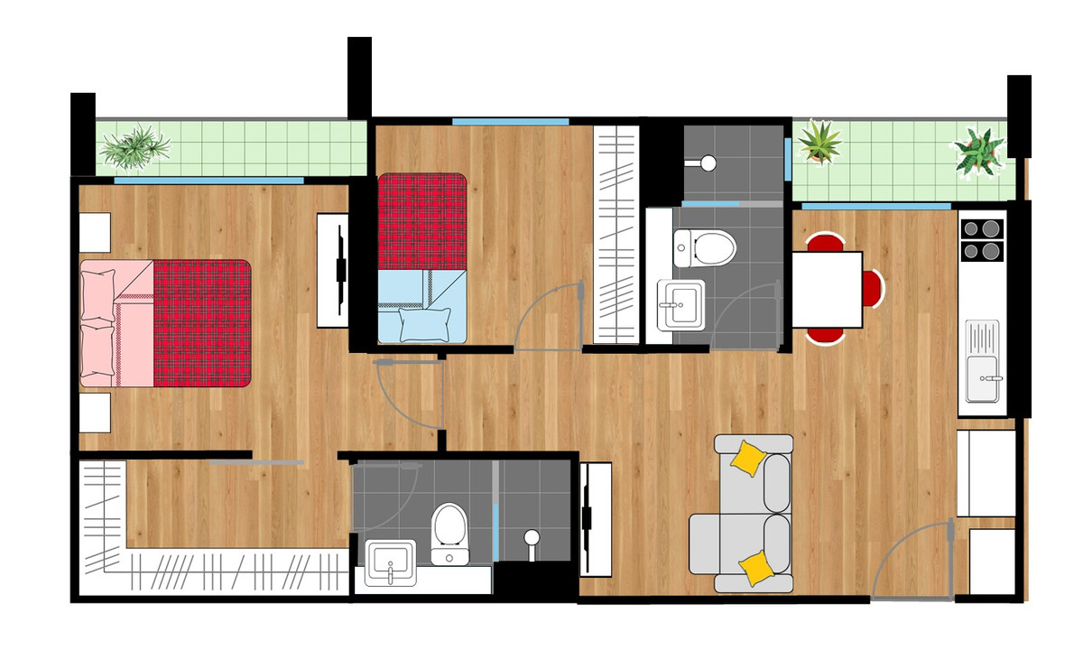 58 sq m., 2 bedrooms, 2 bathrooms, with new furniture, new kitchen, three new inverter air conditioners, new flooring, new electric switches and sockets, newly built bathrooms, new appliances. Two Samsung TV-sets (55" and 43"). Samsung 14.7 cu ft refrigerator. Wash&Dry Toshiba washer. Four-burner stovetop (two induction and two radiant). Toshiba microwave oven. Both bathrooms equipped with forced ventilation. LED lighting throughout the apartment. Two balconies with bird netting. Ample storage space with a walk-in closet in the master bedroom, a large closet in the single room, and cupboards, drawers and cabinets to store kitchenware and small and large objects. Electricity and water bills are at Thai rates (to be paid by the tenant directly to the condominium juristic person and to MEA respectively). Minimum: One-year lease contract. Included: safety ladder, trolley for transporting heavy supplies to the floor. Extra: AIS fiber available at a reasonable price.