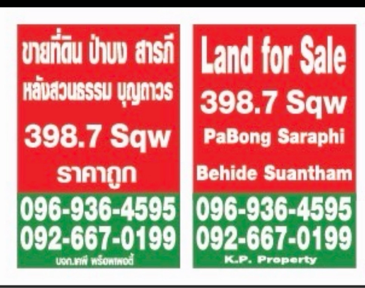 Land for sale, 398.7 sq m, Pa Bong, Saraphi, Chiang Mai, behind Suan Thambunthaworn, very cheap price#