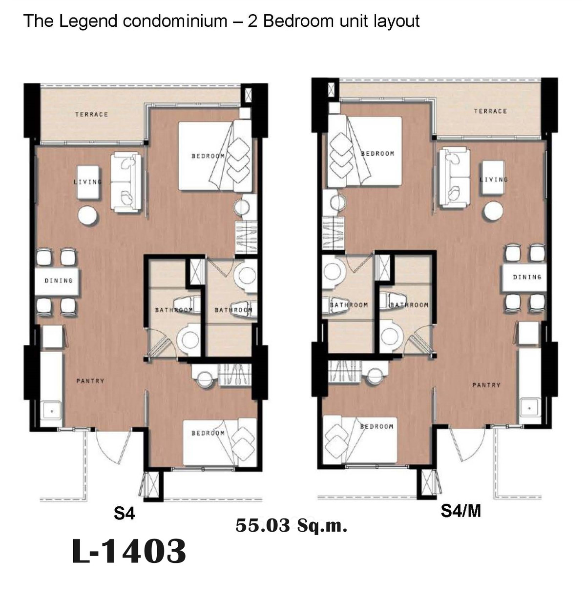 Room L-1403 (1511/126) size 55.03 sq m. 14th floor, sea view and swimming pool 2 bedrooms, 2 bathrooms Price 5,463,971 baht Receive an on-top discount of 200,000 baht The remaining net price is 5,263,
