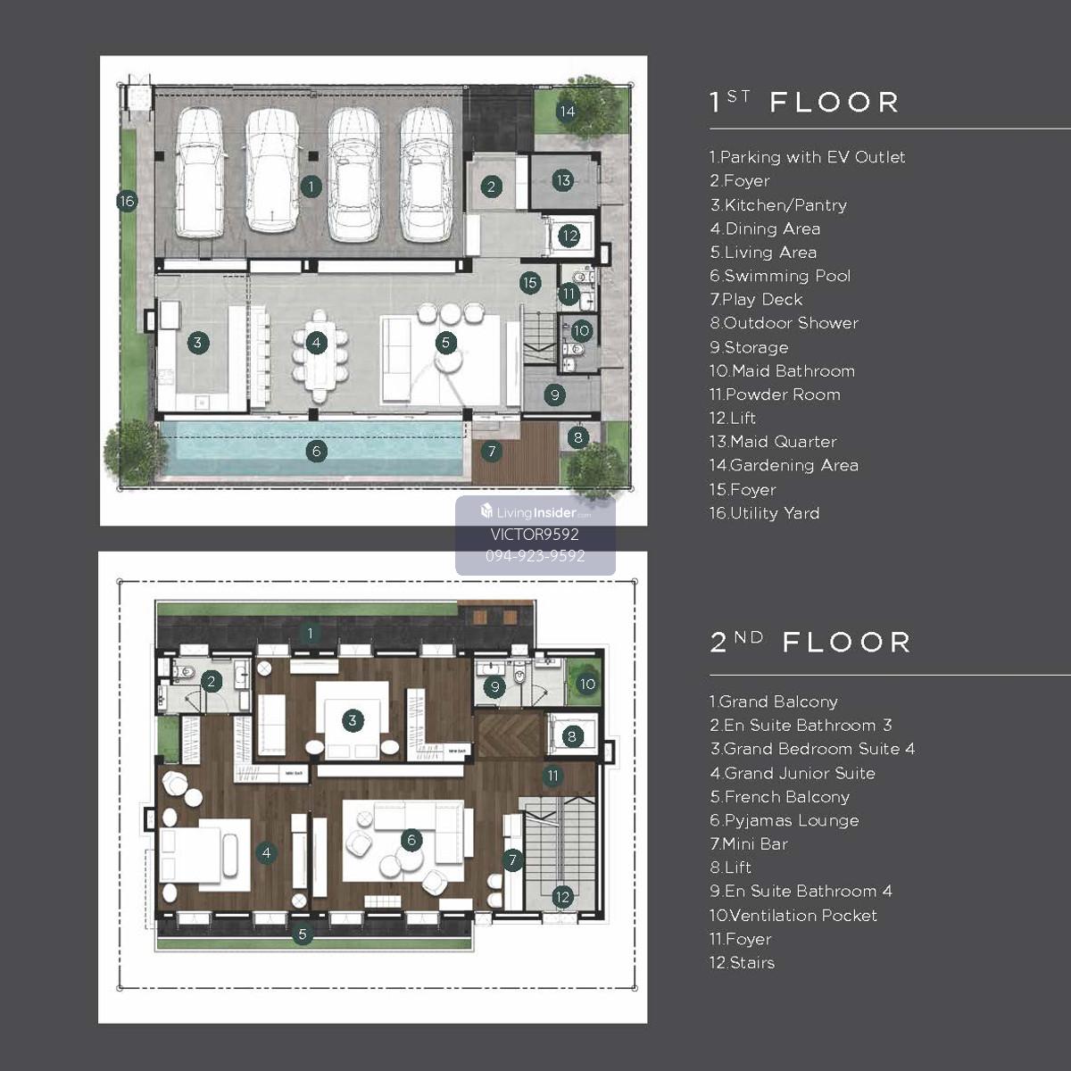 1st floor: 4 car parking spaces (EV Ready), 10 meter long swimming pool, Living Area with high ceilings, European kitchen with Pantry, and separate maids room
