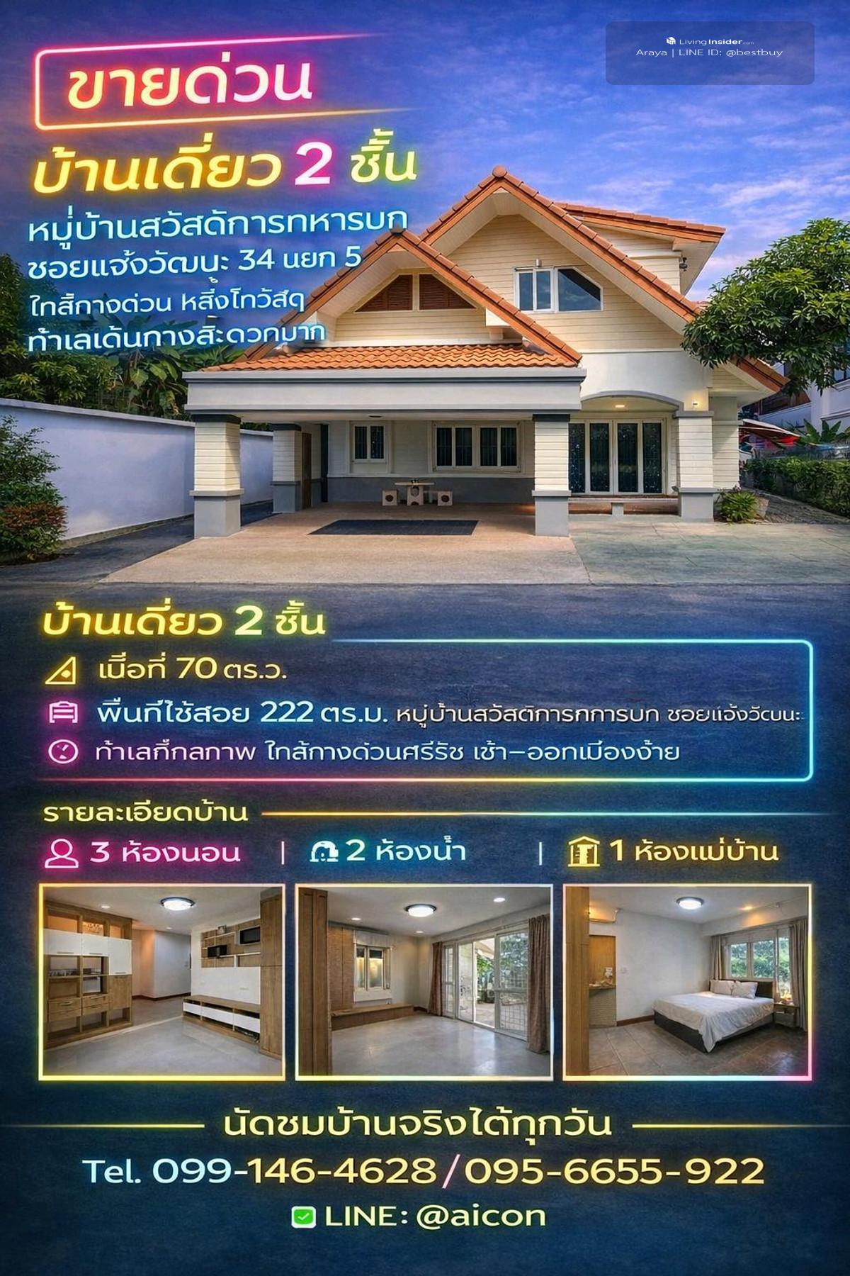 🔥 Most urgent! The owner really wants to sell!! 🔥 Large detached house, Chaengwattana, 70 sq m, selling cheaper than appraised price! Price cut to only 5.2 million baht!! 😱💸 Who is looking for a house in Chaengwattana area? Stop looking at this post first! At this price, theres a lot of space. I cant find it anymore! 📍 Army Welfare Village (Soi Chaengwattana 34, Intersection 5), behind Thai Watsadu, near Si Rat Expressway. Traveling in and out of the city is very convenient! 🚗💨 🏡 Details of value (getting it is finished, dont have to do much extra): ✅ Spacious area: 70 sq m. | Usable area 222 sq m. ✅ Complete functions: 3 bedrooms 🛏️ | 2 bathrooms 🛁 ✅ Meet family needs: There is a bedroom on the ground floor. Supports the elderly No need to walk up and down to cause knee pain 👵👴 ✅ Service zone: 1 maids room + Thai kitchen & Western kitchen, clearly separated 🍳🥗 ✅ Free gift: 4 air conditioners ❄️ ✅ Excellent Feng Shui: House facing south, receives cool breezes, saves on electricity costs all year long. 🌬️🍃 🎯 Prime location, easy to travel, close to everything: 📌 Thai Watsadu Chaengwattana, walk only 500 m. 📌 Si Rat Expressway, drive only 5 minutes 🛣️ 📌 Mongkutwattana Hospital 2.5 km. 🏥 📌 Central Chaengwattana 3 km. 🛍️ 📌 MRT Pink Line / Lak Si 🚆 💥 Repeat again! Selling for only 5.2 million baht!! 💥 (Large house, very good condition, price lower than appraisal. Push the loan amount easily! 💰) Perfectly suitable. For families who need a lot of space In a location in the heart of the city that is getting more expensive every day! 📲 If interested, you can inquire / make an appointment to see the house : 📞 Call: Contact number (Khun Or) 🟢 Line ID: @aicon 📩 Inbox, chat with us to talk first.