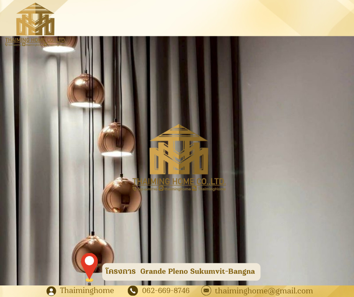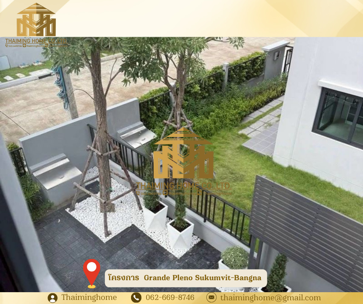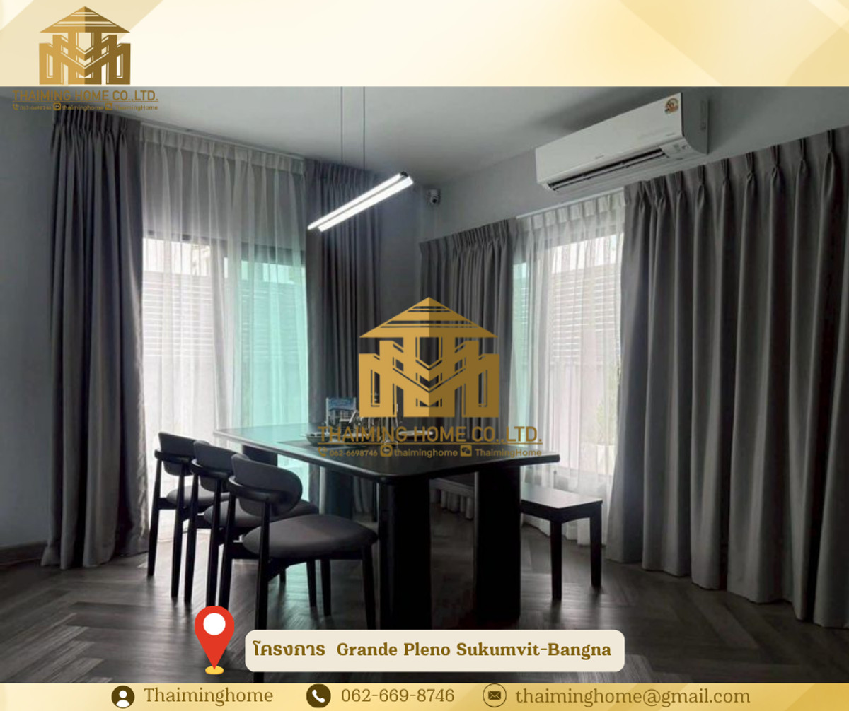 House for Rent/Sale Grande Pleno Sukumvit-Bangna, 46.4 sq.wah, Bang Phli, Samut Prakan (TH06-1526) Details - Land size 46.4 sq.wah, usable area 161 sq.m. - 3 bedrooms, 4 bathrooms - 2 parking spaces - Furniture: Full Furnished - Amenities: Clubhouse, Swimming Pool, Fitness Center, Security System - Pet Friendly Nearby Places - Mega Bangna - Market Village - Suvarnabhumi Airport - Prince Suvarnabhumi Hospital - Sinpatt Srinakarin Hospital - Thai-Singapore International School Rental Conditions - Minimum 1-year contract - 2 months security deposit - 1 month advance payment - Rent: 69,000 THB/month ✅ Sale Price: 9,590,000 THB ------------------- บริษัท ไทยหมิง โฮม จำกัด Thaiming Home Co.,Ltd. 泰明房园 房产公司 ----------------------- Contact ติดต่อ : Contact number Contact : Contact number คุณหมิง(中文) Line ID: thaiminghome Line ID: @thaiminghome https://lin.ee/PkkHwYv Wechat : ThaimingHome E-mail : Contact email -----------------------