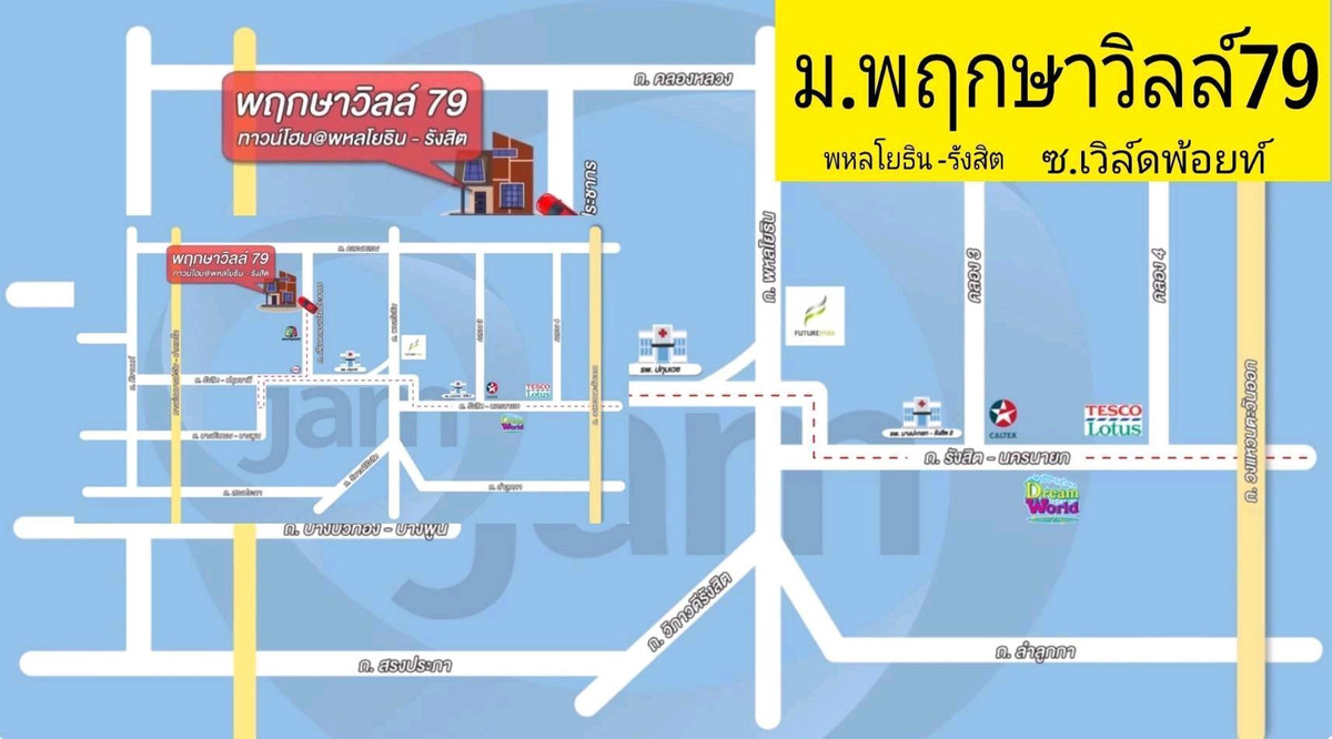 Details 2-story townhome, Pruksa Ville 79 project (Phahonyothin-Rangsit) 3 bedrooms, 2 bathrooms, 1 kitchen, 1 parking Nearby places - Future Park Rangsit - Central Rangsit - Index Living Mall - HomeWorks Rangsit - Big C Rangsit - Tesco Lotus Rangsit - Major Cineplex Rangsit - Ekpathum Hospital