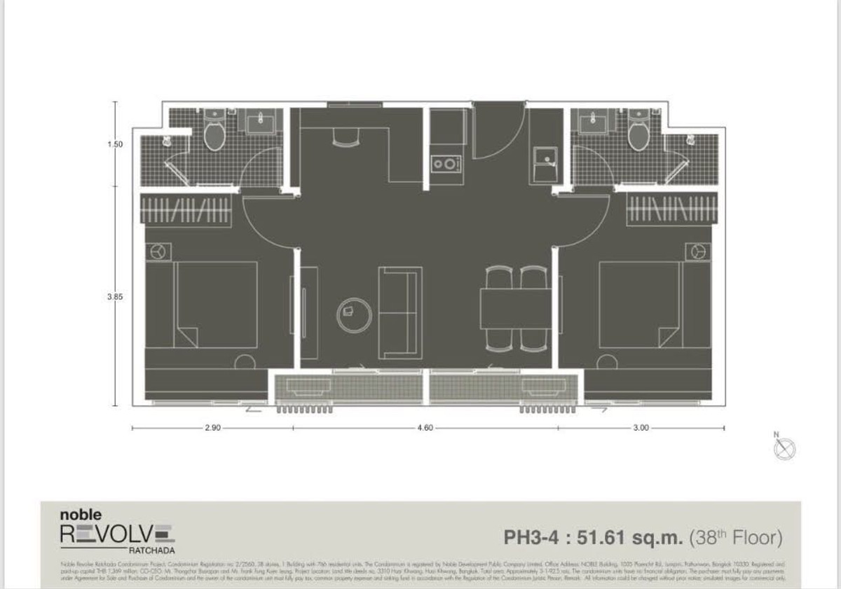 Luxury Penthouse for Rent with unblocked panoramic city view. Only 4 units per floor, very quiet and private. 📍 Noble Revolve Ratchada 1 2 Bedrooms | 2 Bathrooms (Ensuite) Top Floor Penthouse 4-meter