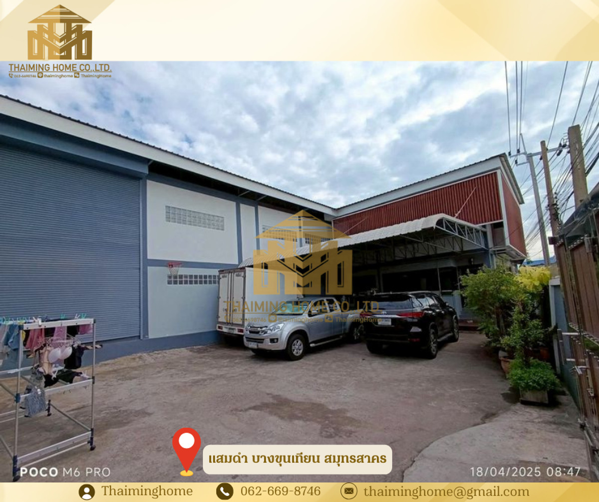 For sale/rent: 2-story factory in Rama 2, Bang Kradee area. Excellent location. Includes factory license (Form 4) and solar power system. Multiple Access Points (TW8-08326) Details - Location: Soi Bang Kradee 19, Samae Dam Subdistrict, Bang Khun Thian District, Bangkok. - 2-story factory + 2-story owner's residence + 7 worker accommodation rooms. - Factory usable area: 850 square meters (excluding accommodation). - Parking area: 200 square meters, accommodating 5 vehicles. Container trucks can easily access the property. - Land size: 214 square wa (approximately 866 square meters), 40 meters wide and 33 meters deep. - 6-meter wide road in front of the factory. Highlights - Has a valid factory license (Form 4). - 3-phase electrical system with a 200 amp transformer. - 42 kW solar power system installed. Nearby Locations - Good location with multiple access points. - Close to Rama 2 Road and Kanchanaphisek Road. - Convenient access to Burapha Viithi Expressway. Flood-free area. Conditions - Sale Price: 20 Million Baht - Rental Price: [Price will be adjusted] 150,000 THB/month - 2 months security deposit / 1 month advance payment - 3-year contract ________________________ บริษัท ไทยหมิง โฮม จำกัด Thaiming Home Co.,Ltd. 泰明房园 房产公司 _________________________ Contact ติดต่อ : Contact number Contact : Contact number คุณหมิง Line ID: thaiminghome Line ID: @thaiminghome https://lin.ee/PkkHwYv Wechat : ThaimingHome E-mail : Contact email _________________________