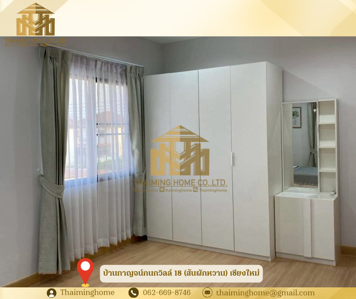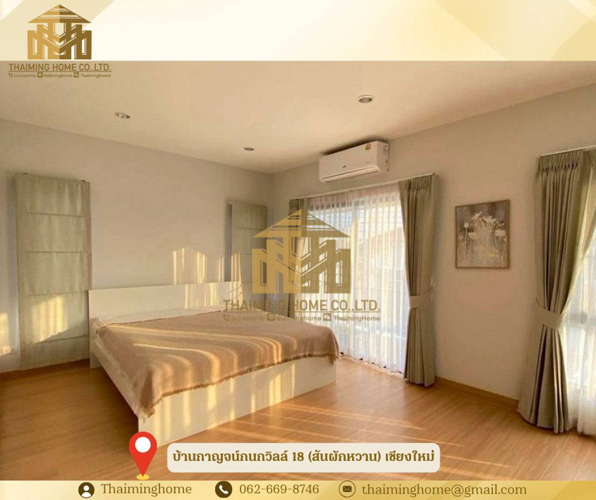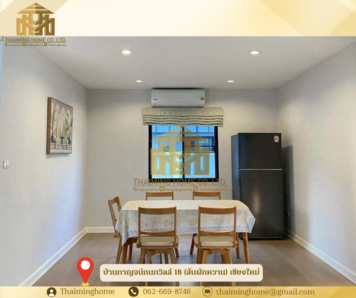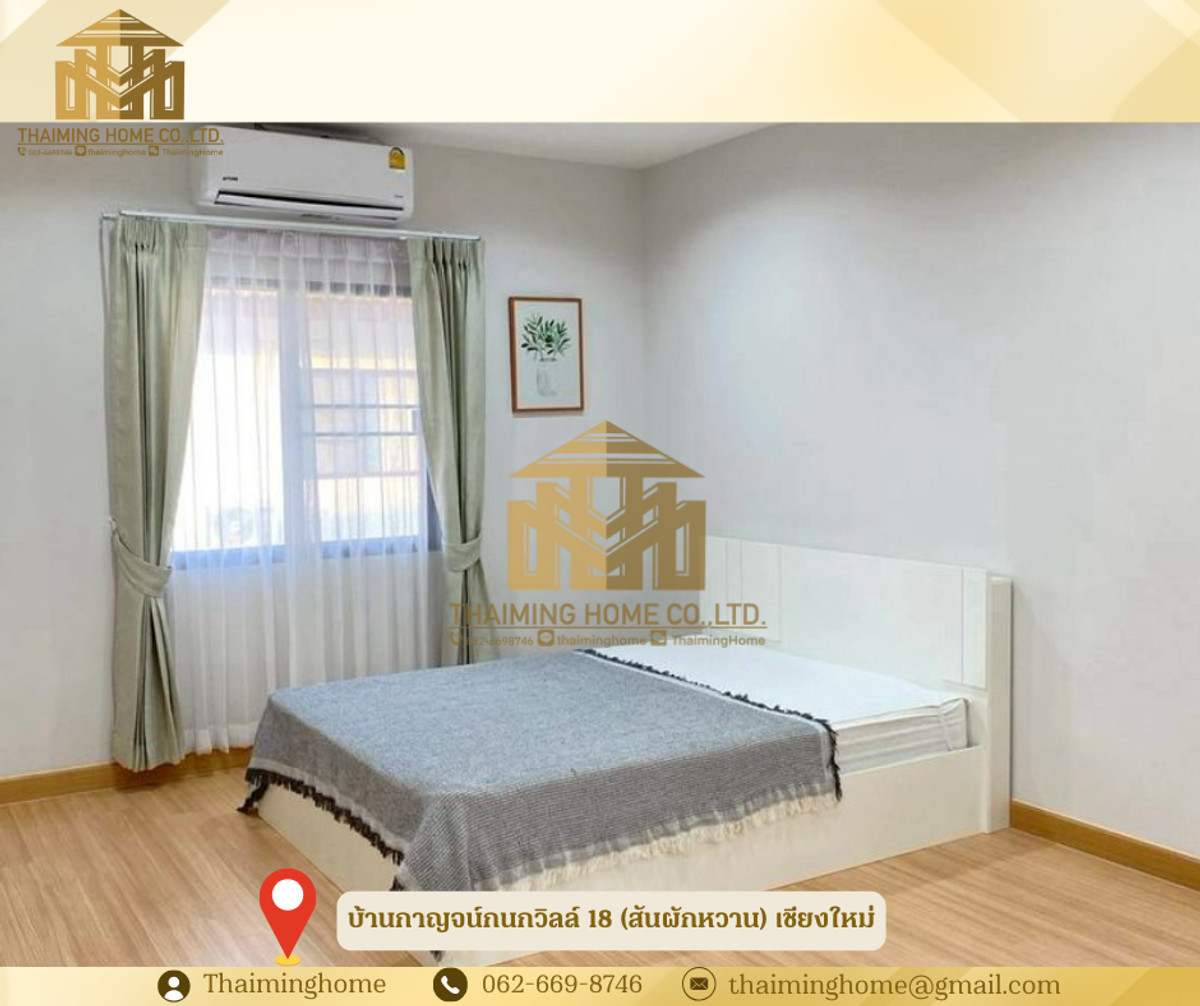 House for Rent!! Flood-free, 4 Bedrooms, 3 Bathrooms, Near Lanna International School, German Christian School, Kanjanakanok Ville 18 (San Phak Wan) (TH8-03526) Details - 4 Bedrooms, 3 Bathrooms - 200 sq.m. usable area - 96 sq.wah land area - Very large lawn - Extended carport - Side terrace for morning coffee - Fully furnished house - 5 Air conditioners (4 bedrooms + 1 living room) - 3 Water heaters - Digital door lock - Built-in kitchen with island - Washing machine - TV - Refrigerator - No more than 2 dogs allowed, no cats Terms - Price: 38,000 THB/month, 1-year contract - Special Offer!! Pay 6 months in advance, reduced to 36,000 THB - 2 months deposit, 1 month advance payment **Note: Decorations, vases, pillows, and bedding are not included.** ________________________ บริษัท ไทยหมิง โฮม จำกัด Thaiming Home Co.,Ltd. 泰明房园 房产公司 _________________________ Contact ติดต่อ : Contact number Contact : Contact number คุณหมิง Line ID: thaiminghome Line ID: @thaiminghome https://lin.ee/PkkHwYv Wechat : ThaimingHome E-mail : Contact email _________________________