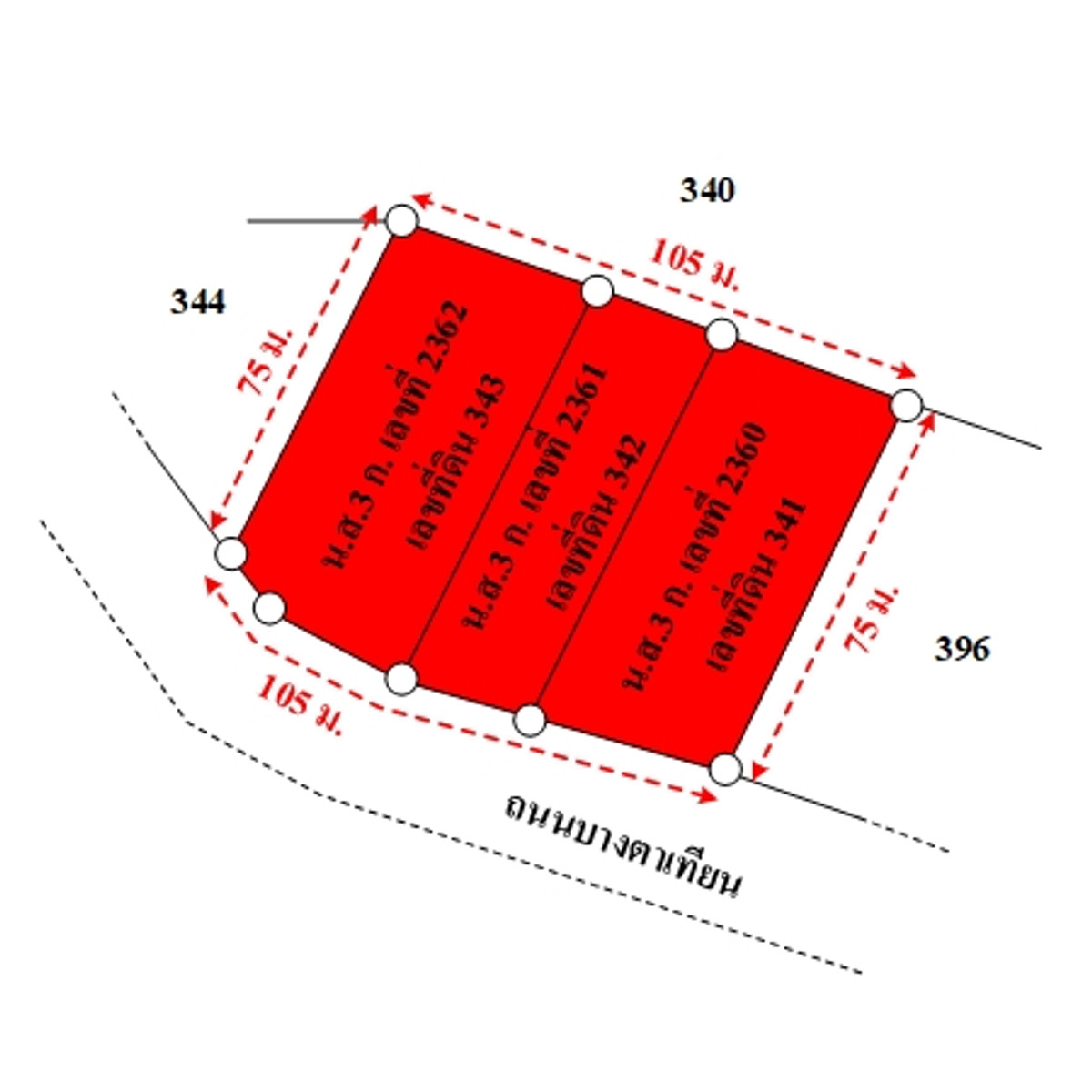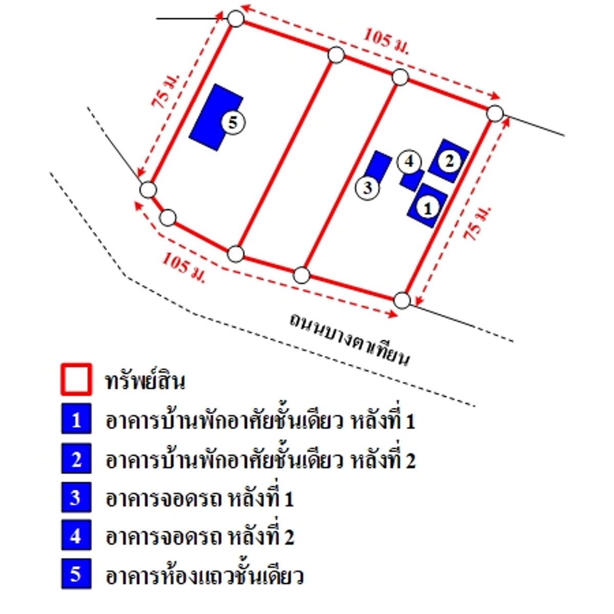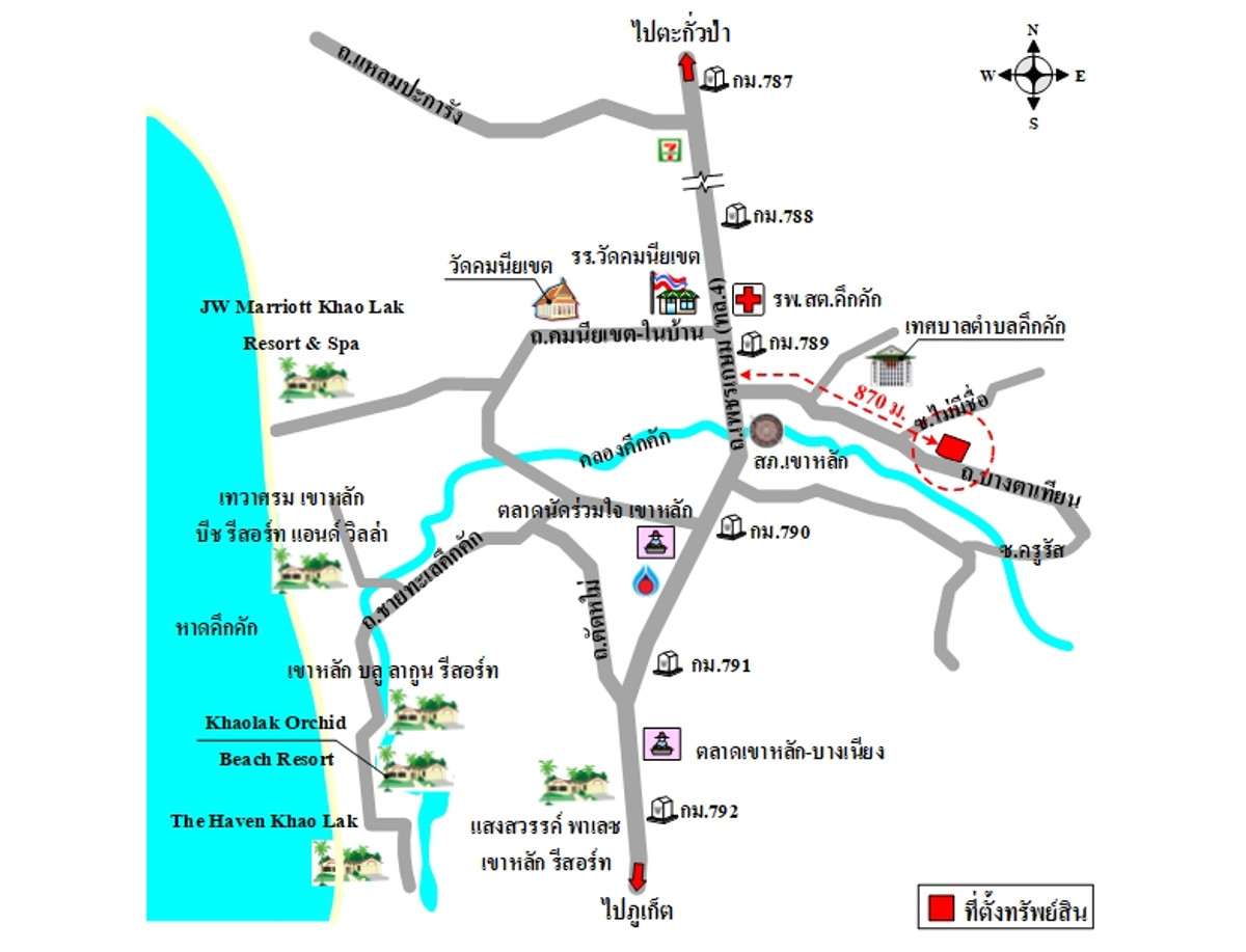 Three plots of land next to each other, shaped like a rectangle. The size of the plot on the south side next to the road is approximately 105 m. wide, approximately 75 m. deep. The land level is a high-low hillside according to the topography BAMC accepts the transfer of ownership of the building. Consists of 1. One-story residential building, number 42 2. One-story residential building, number not listed 3. Other 1-story buildings, number not listed 4. Concrete fence 5. Parking garage 6. One-story roof frame Property condition survey information It was found that on the property land there were 5 buildings, consisting of 1. 2 one-story residential houses 2. 2 parking buildings 3. One-story shophouse building The road passing in front of the property is Bang Ta Thian Road (Highway 3138) which is a public road. The paved road surface is approximately 6 m wide. The road zone is approximately 8 m wide. Note. : -The property is located in a residential area. Convenient transportation - The property is located approximately 3.7 km from Khao Lak beach - Nearby important places include Khuk Khak Subdistrict Municipality. Khao Lak Provincial Police Station Khukkhak Subdistrict Health Promoting Hospital, etc. - Land title document type Nor S. 3, Ms. 3 Kor., Ms. 3 Kh., reservation letter, Aug. 1, Nor. S. 5, Nor. S. 2, location of the property according to the land image specified on the front of the title document. There may be discrepancies in the size of the land distance. Amount of land area, land boundaries and other important matters of property Interested in assets, contact Oil Contact number
