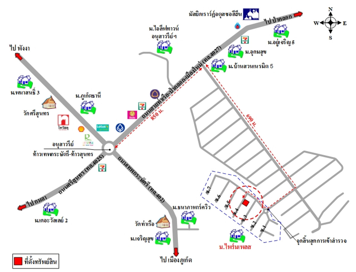 The land is rectangular. The size of the land plot on the west side next to the road is approximately 17 m. wide, approximately 13 m. deep . The road passing in front of the property is the road within Prime Place Village, Soi 4, which is a road in a development project that has received permission. The reinforced concrete road surface is approximately 8 m. wide. The road area is approximately 10 m. wide. Note: - The property is located in a residential area. and commerce - Nearby important places include the Thao Thep Kasattri and Thao Sri Sunthon monuments, Thai Watsadu Phuket Thalang, Wat Sri Sunthon and Robinson Lifestyle Thalang, etc. If interested, contact Oil Contact number