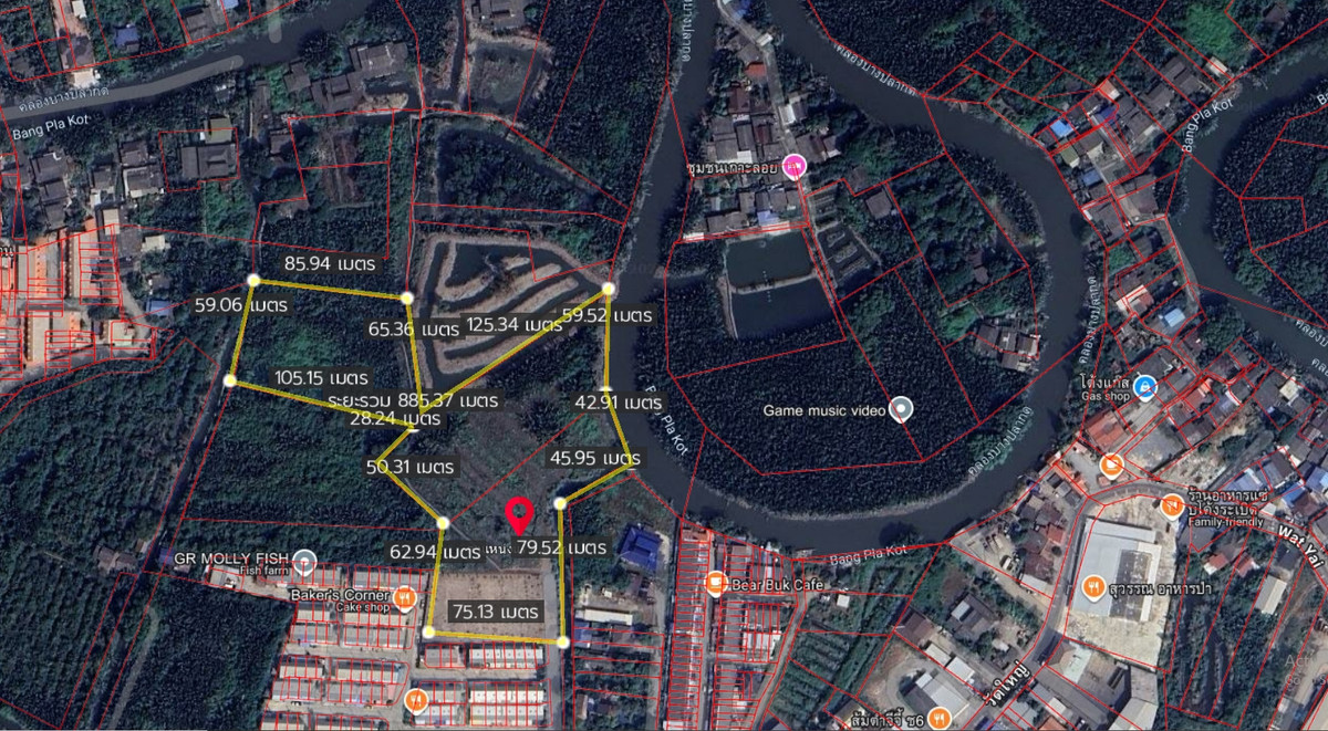 Land for sale coordinates Soi Suksawat 100 , opposite Bang Saeng Park Market (Soi Thongkham) is next to Pruksa Village. 128 3 title deeds totaling 15 rai Price 6,000,000 baht per rai Transfer fee will