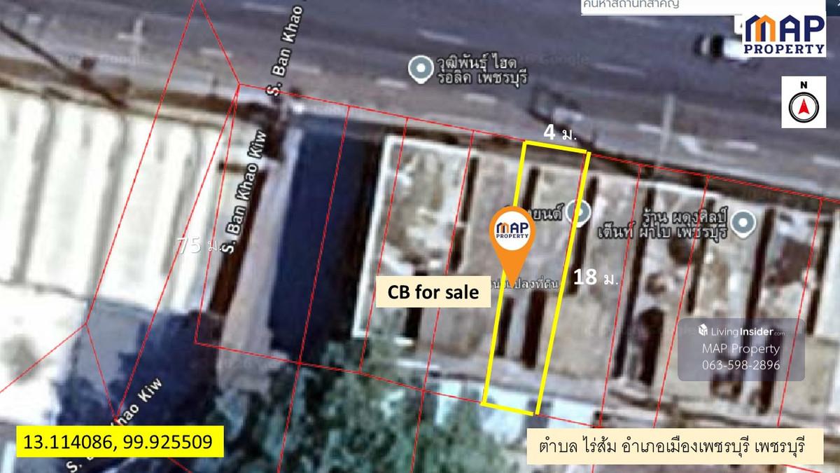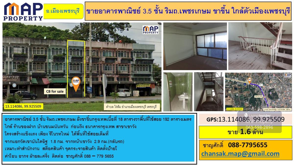 3.5-story commercial building on Phetkasem Road, Bangkok-bound side. - Land area: 18 square wah (approximately 72 square meters) - Usable area: 192 square meters Nearby locations: - Souvenir shop (Baan Khon Nanthanwan) - Before Bangkok Bank (Khao Wang branch) - Strong structure, only needs renovation to maximize usable space. - 1.8 km from Wat Khao Bandai It intersection. - 2.9 km from Khao Wang (U-turn required) Suitable for: - Office - Warehouse - Distribution center - Signage installation Transfer fees/stamp duty split equally between buyer and seller. For inquiries or to schedule a viewing, please contact: 0.88.779.5655