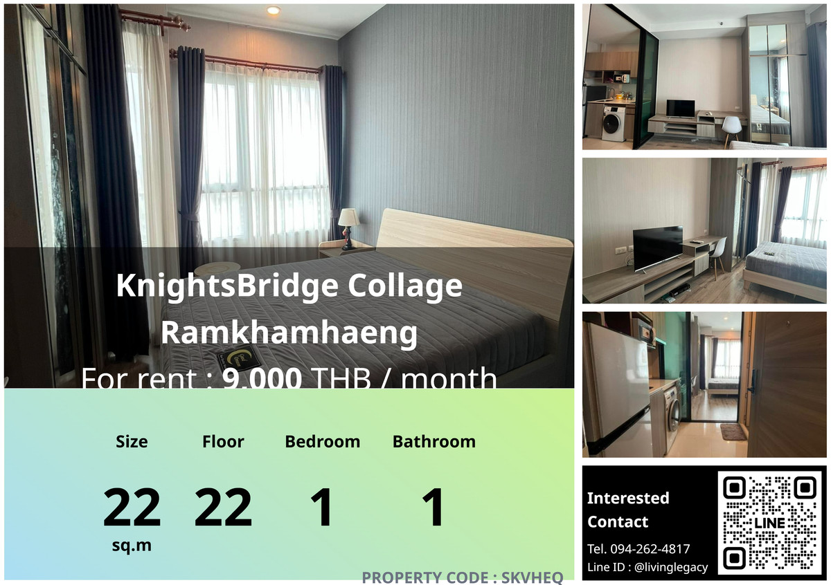 🏠 SKVHEQ Condo for rent KnightsBridge Collage Ramkhamhaeng 22 sq m, 22nd floor, 1 bedroom, 1 bathroom ✨ Ready to move in immediately! Beautiful room, fully decorated Ready to move in! 🔍Details - Number of bedrooms: 1 - Number of bathrooms: 1 - Usable area (sq m): 22 - Floor: 22 🌟 Highlight of this room! 🌟 🌟Various amenities 📞 Hurry and reserve now! Ask for more details Price 9000 baht Property code: SKVHEQ If interested, contact Add Line ID: @livinglegacy Facebook: LivingLegacy WhatsApp: https://wa.me/ Contact number Interested in other rooms in the project, click: https://living-legacy.atrobot.asia/property-listing/668d2b9fbe0e547fa057d133 #KnightsBridgeCollageRamkhamhaeng #hospitalBangkok #Panda Clinic #RamkhamhaengHospital #FacultyofScienceTec hnology #TawannaMarket #PSBCompanyLimited #CompanyTwoWayRadioCommunicationsLimited #GraduateSchoolofCounselingPsychology #OfficeofBiotechnology #DoctorialProgramtheCatholicUniversityofLeuven